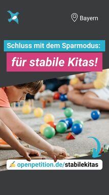 Die Petition „Stabile Kitas! Jetzt Vollgas für faire Bildung“ fordert, dass der Freistaat Bayern mindestens 90 % der anerkannten Betriebskosten übernimmt, um stabile, inklusive und qualitativ hochwertige Bildungsangebote langfristig zu sichern.
