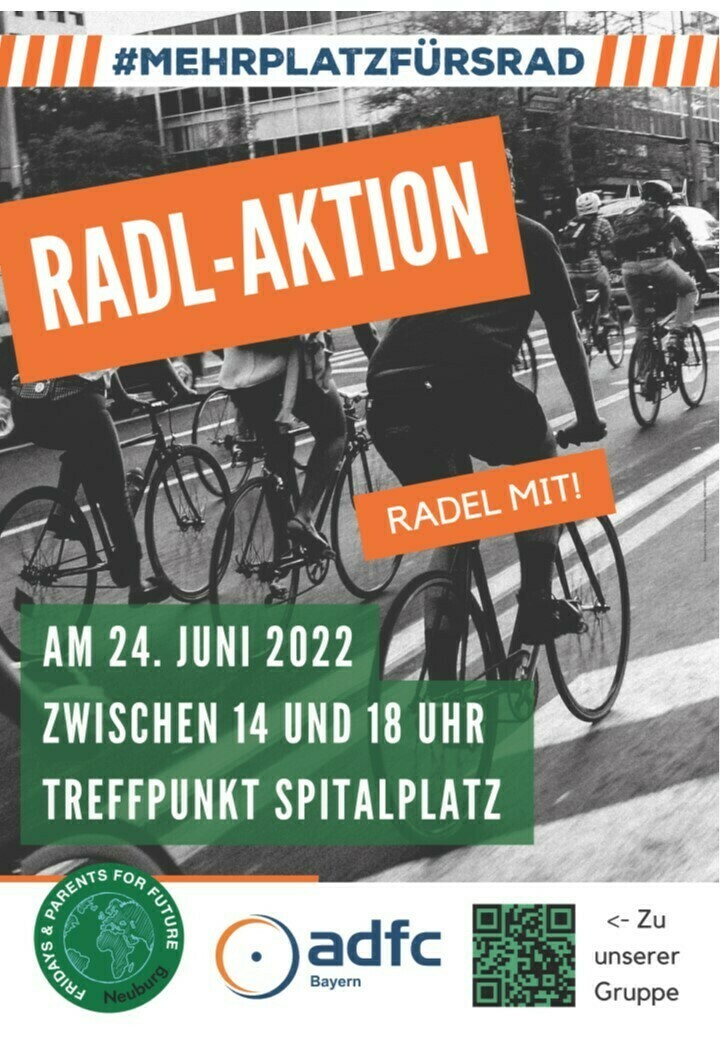 Am Freitag, den 24. Juni 2022 zwischen 14 und 18 Uhr findet am Spitalplatz in Neuburg eine Radl-Aktion unter dem Motto „Mehr Platz fürs Rad“ statt.