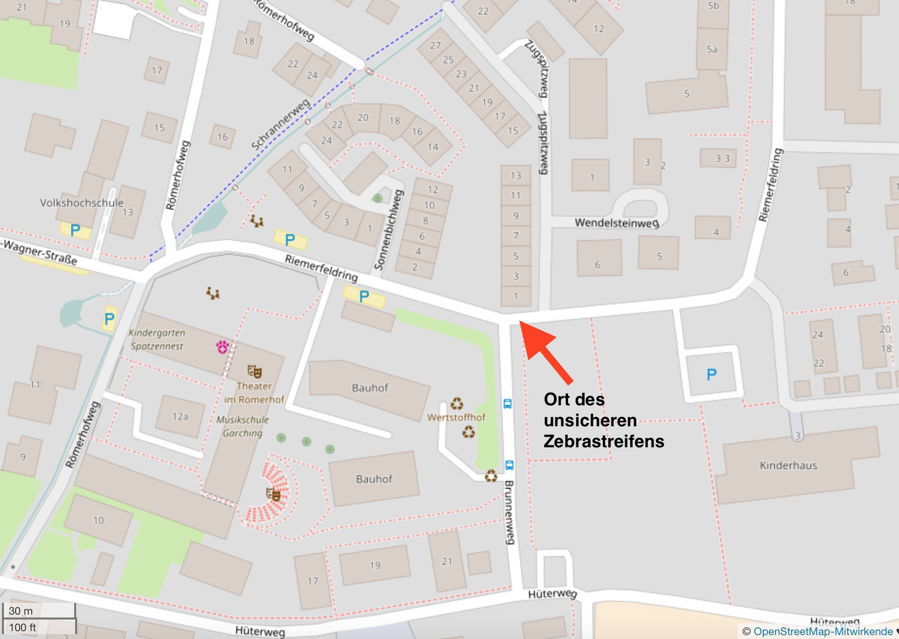 unsere Petition hat gewirkt -- die Zickzacklinie ist in den letzten Tagen auf die doppelte Länge verlängert worden (siehe Bild). Außerdem wurde eine Geschwindigkeitsmessanlage aufgestellt (auch auf dem Bild zu sehen). Die Stelle ist zwar nach wie vor nicht ganz übersichtlich, aber doch deutlich sicherer als vorher.