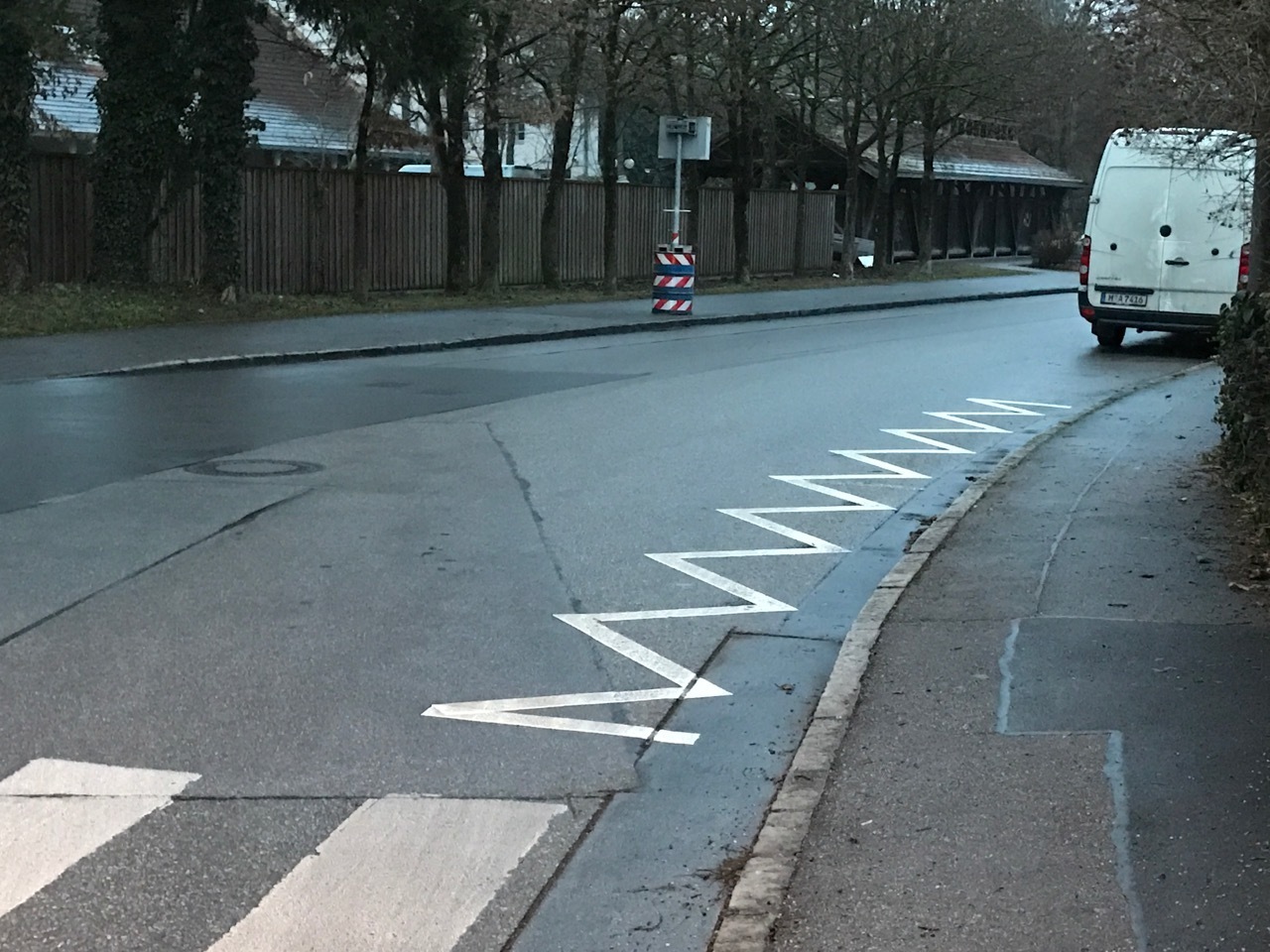 unsere Petition hat gewirkt -- die Zickzacklinie ist in den letzten Tagen auf die doppelte Länge verlängert worden (siehe Bild). Außerdem wurde eine Geschwindigkeitsmessanlage aufgestellt (auch auf dem Bild zu sehen). Die Stelle ist zwar nach wie vor nicht ganz übersichtlich, aber doch deutlich sicherer als vorher.