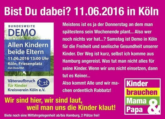 Am Samstag, den 11. Juni organisiert der Väteraufbruch Köln eine Demo für eine Reform des Familienrechts und gegen die Diskriminierung von Vätern.