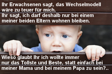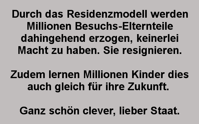 Dies kann aber nicht durch den Geldfluß innerhalb der getrennten Eltern geschaffen werden: es bringt nichts, wenn ein Vater bei mehr Betreuung weniger zahlen muß, denn die Mutter bekommt dadurch weniger Geld, hat Grund dies zu unterbinden. Es muß also Geld von "Außen" in das System kommen.