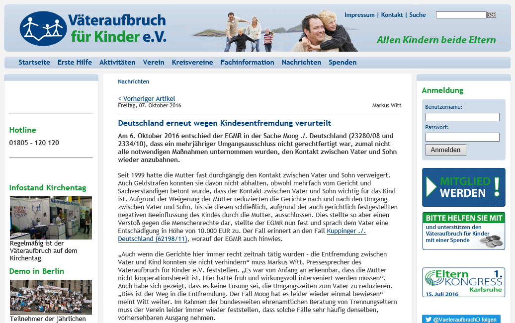 Am 6. Oktober 2016 entschied der EGMR in der Sache Moog ./. Deutschland (23280/08 und 2334/10), dass ein mehrjähriger Umgangsausschluss nicht gerechtfertigt war, zumal nicht alle notwendigen Maßnahmen unternommen wurden, den Kontakt zwischen Vater und Sohn wieder anzubahnen.