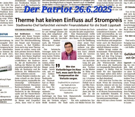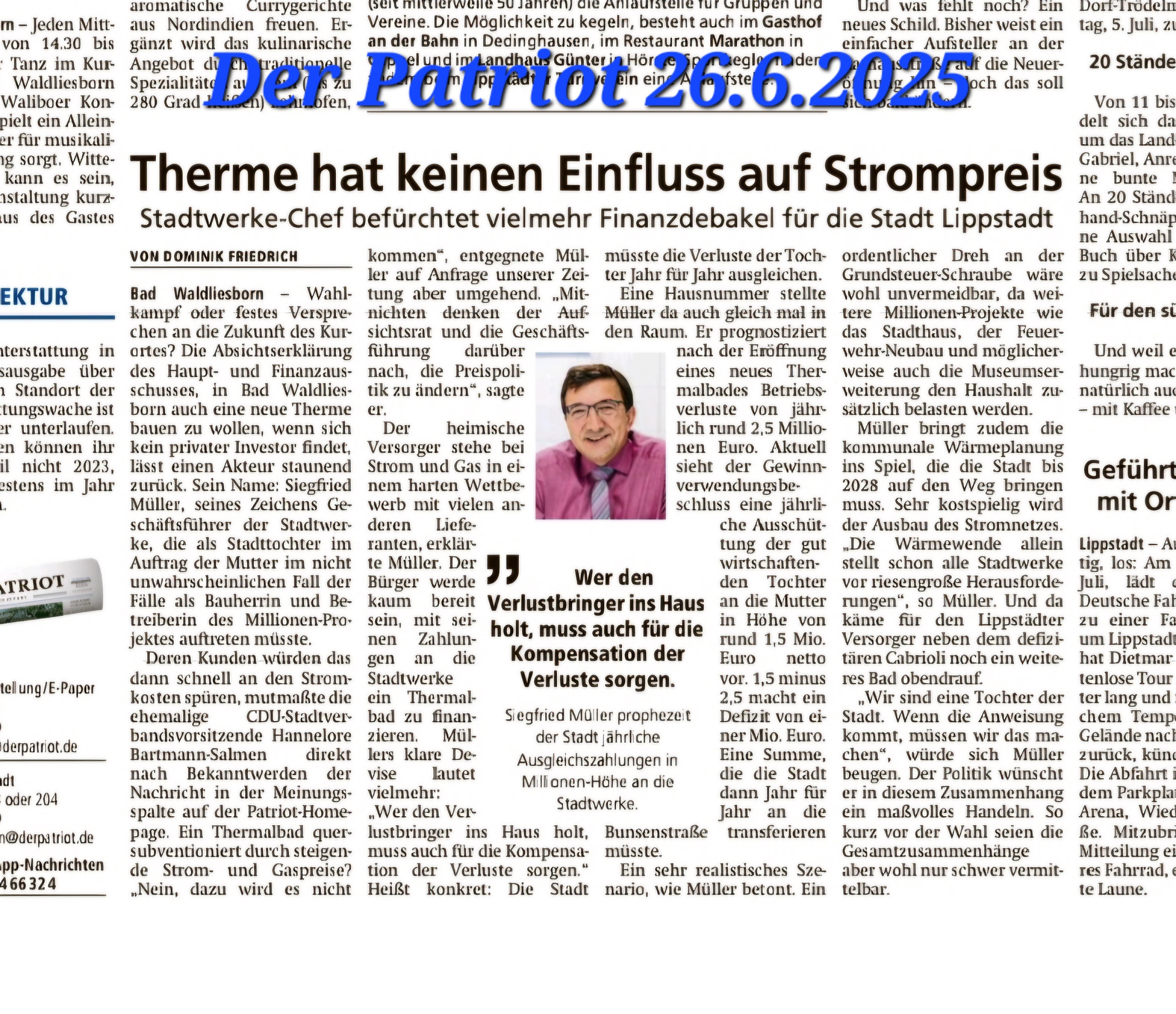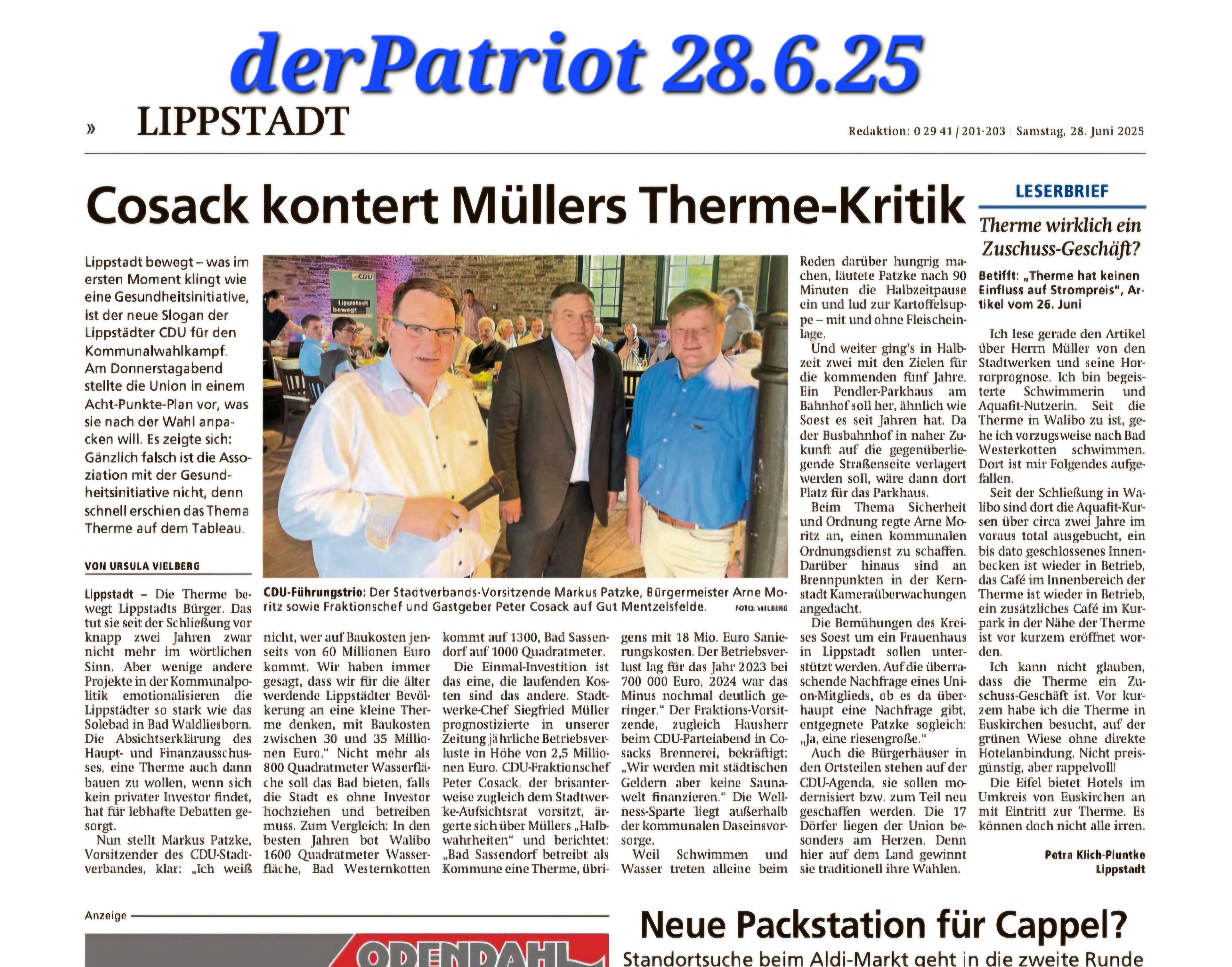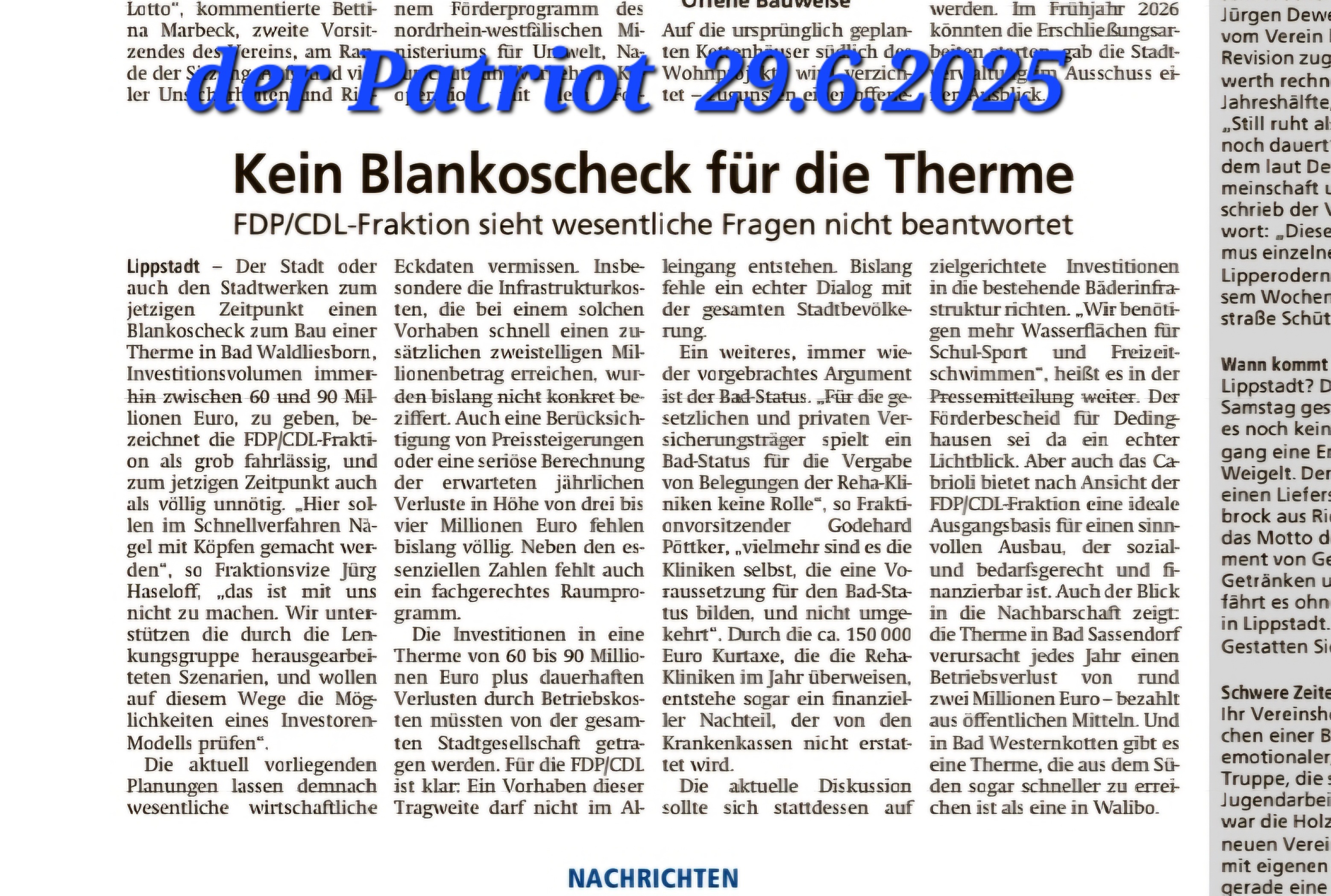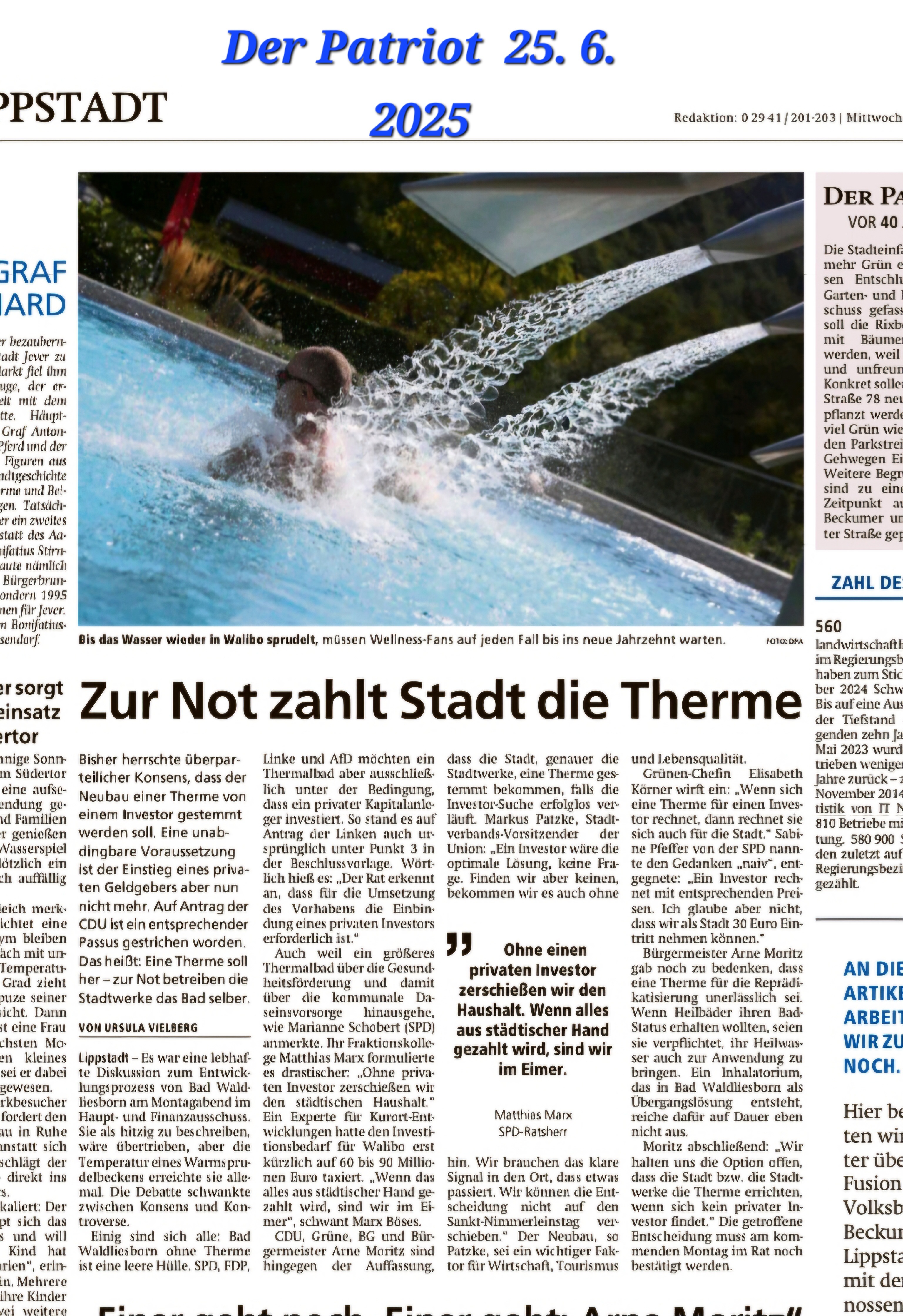 Am Montag, 30. 6. 2025 um 18 Uhr findet in der Mensa der Gesamtschule Lippstadt, Ulmenstraße 31, 59557 Lippstadt die öffentl. Ratssitzug statt. Unter TOP 2 wird über die Therme entschieden.