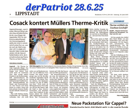 Hier der Artikel aus der Tageszeitung "Der Patriot" von der Sondersitzung des Stadtentwicklungsausschusses. Voraussichtlich wird der Rat der Stadt Lippstadt in der Sitzung am 30. 6. 25 entscheiden ob er hinter dem Konzept steht.
