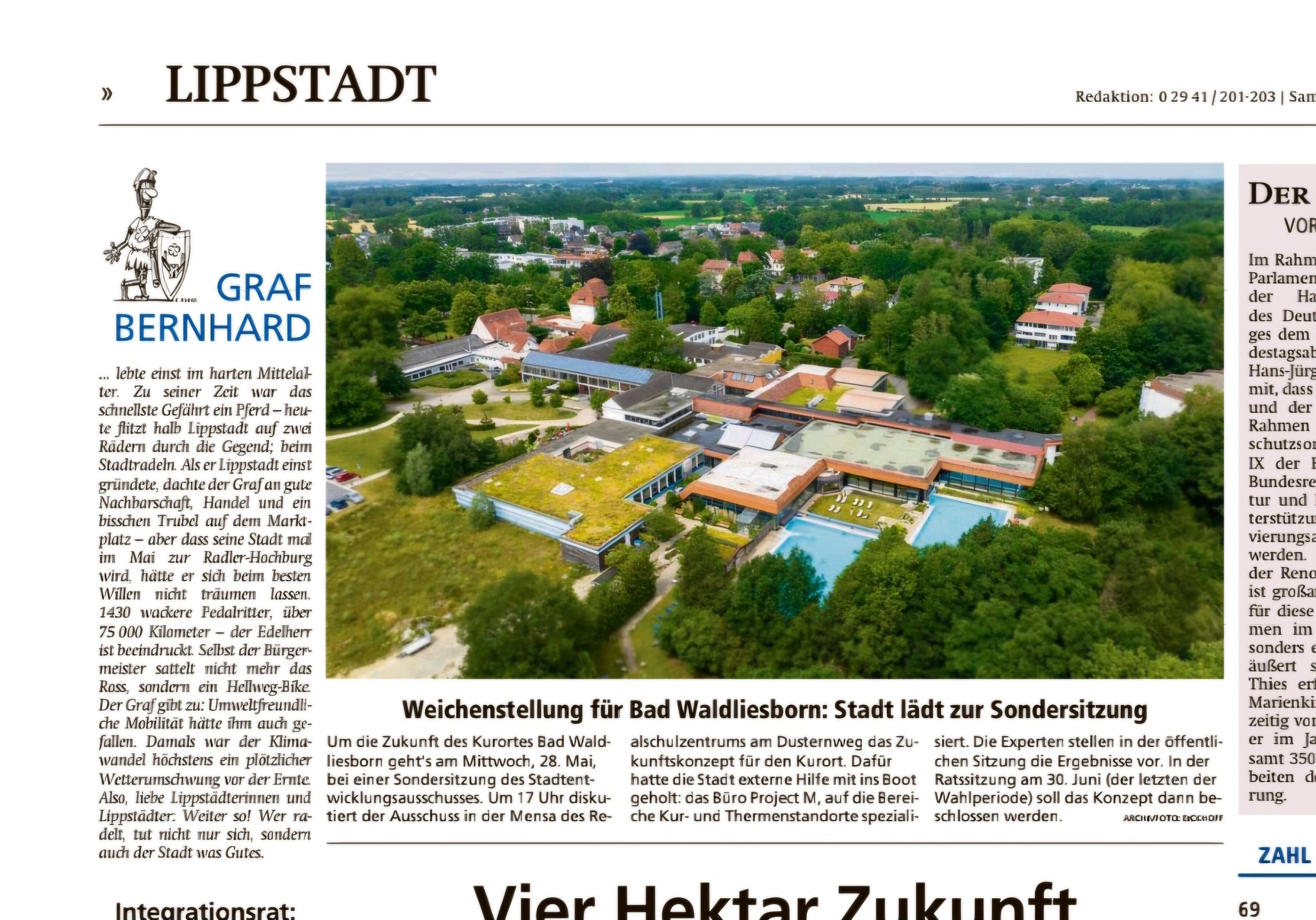 In der Sitzung wird das Zukunftskonzept des Kurotes Bad Waldliesborn vorgestellt. Dafür hatte die Stadt externe Hilfe mit ins Boot geholt, das Büro Project M, was auf die Bereiche Kur- und Thermenstandorte spezialisiert ist. Die Experten stellen die Ergebnisse vor. In der Ratssitzung am 30. Juni soll das Konzept dann beschlossen werden.