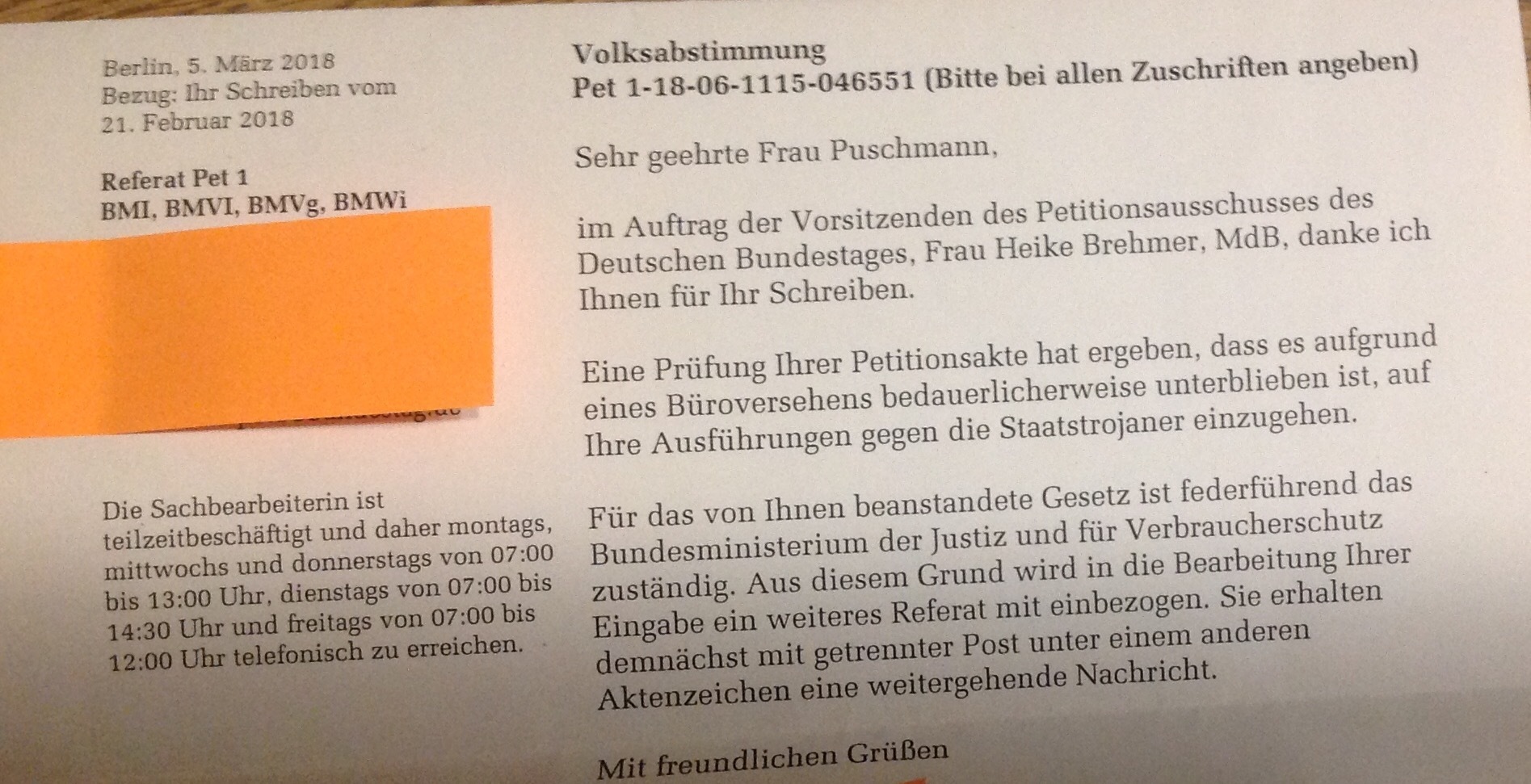 aufgrund meines Schreibens an die Vorsitzende des Petitionsausschusses Heike Brehmer wurde nun bemerkt das es sich um eine Petition gegen den Staatstrojaner handelt. Eine Prüfung der Petitionsakte hat ergeben, dass es aufgrund eines Büroversehens bedauerlicherweise unterblieben ist auf meine Ausführungen gegen die Staatstrojaner einzugehen.