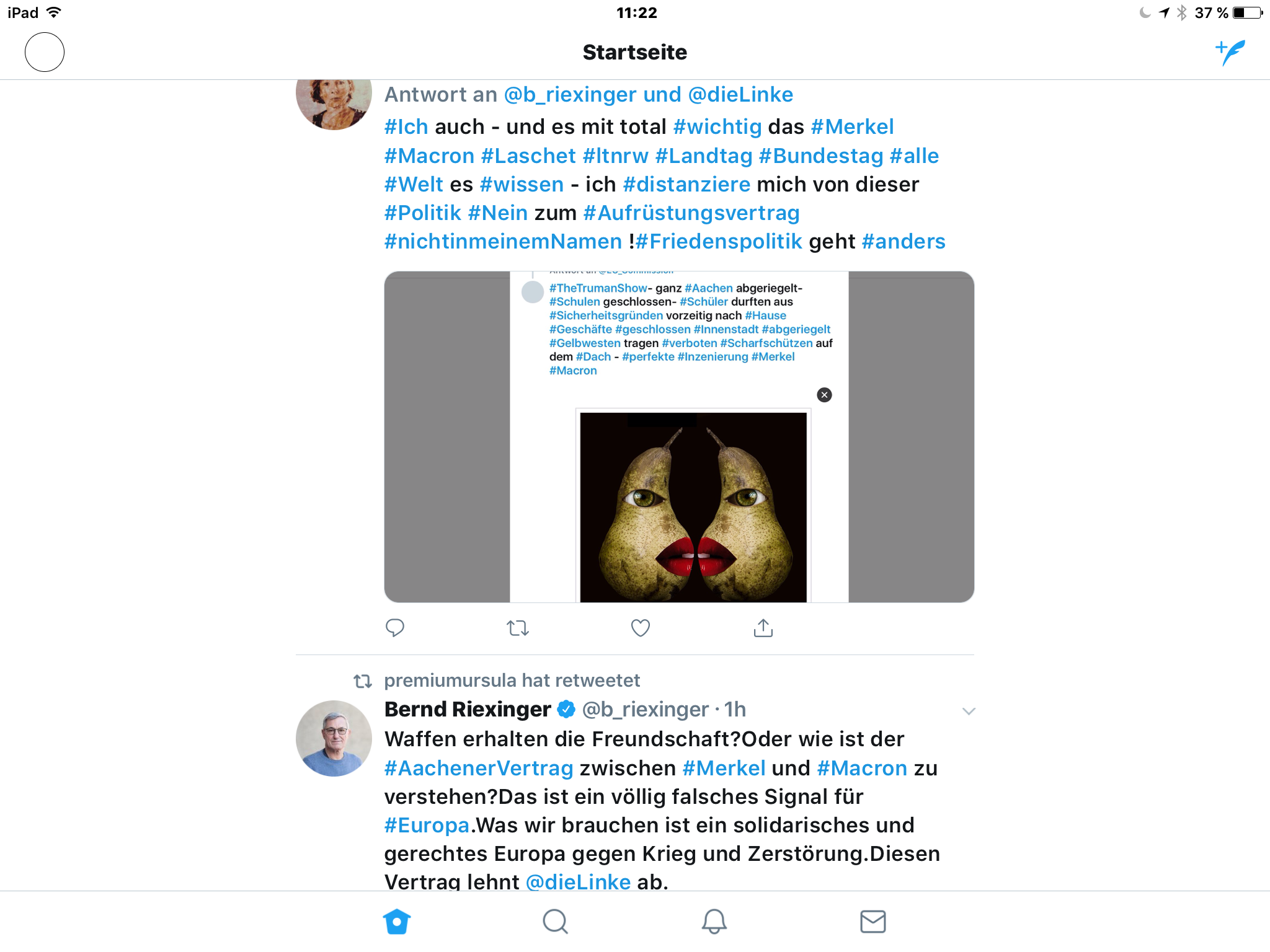 Ich distanziere mich von dieser Aufrüstungspolitik- nicht in meinem Namen und es ist mir auch ganz wichtig das es alle wissen Macron, Merkel, Laschet, der Landtag NRW, der Bundestag - alle Menschen auf dieser Welt- Friedenspolitik geht anders !
