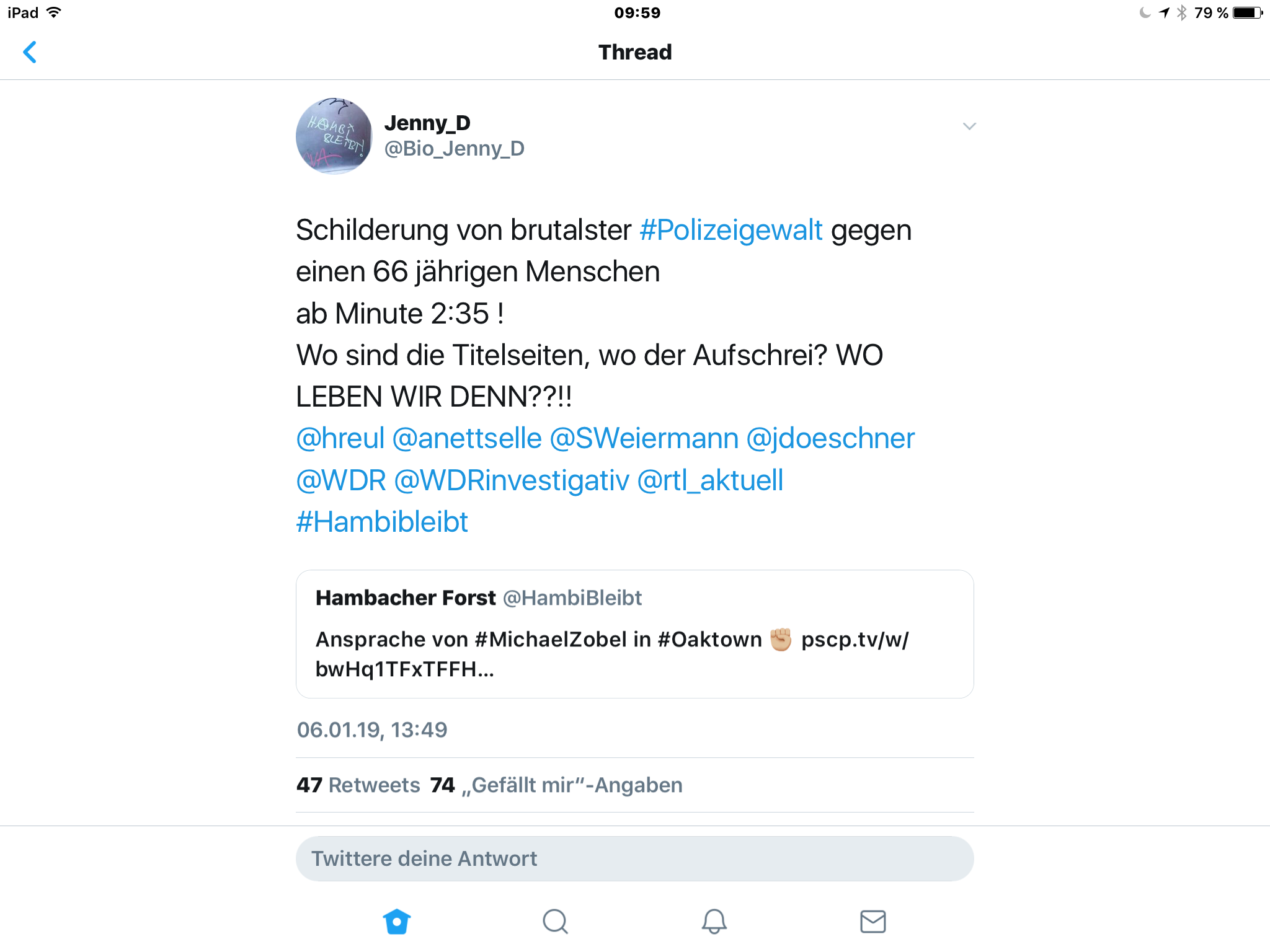 die Zerstörung war nicht Rechtens - ich betrachte die ganze Angelegenheit auch unabhängig davon, dass es unmoralisch ist einen Wald abholzen zu wollen auch vom künstlerischen Aspekt. Jedes Baumhaus ist ein Kunstwerk für sich gewesen und die Klimaaktivisten sind m.E. Künstler. In der Kunst geht es immer darum etwas sichtbar zu machen und die Menschen wach zu rütteln.