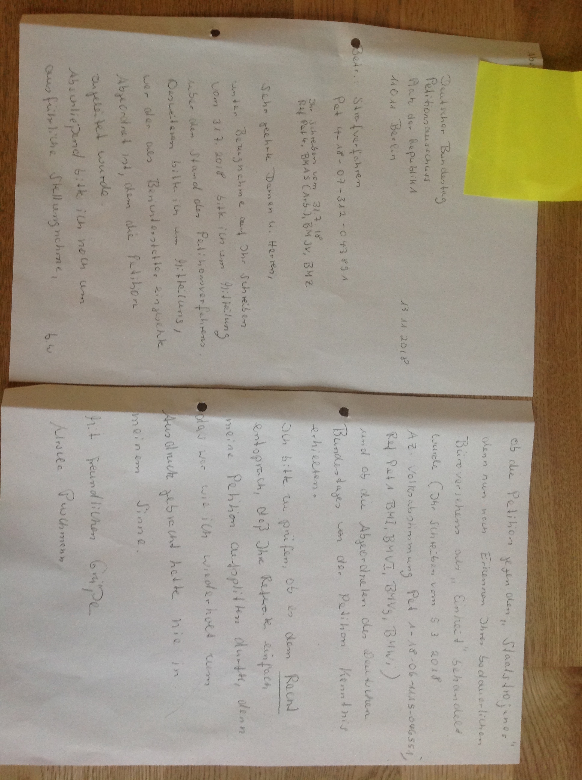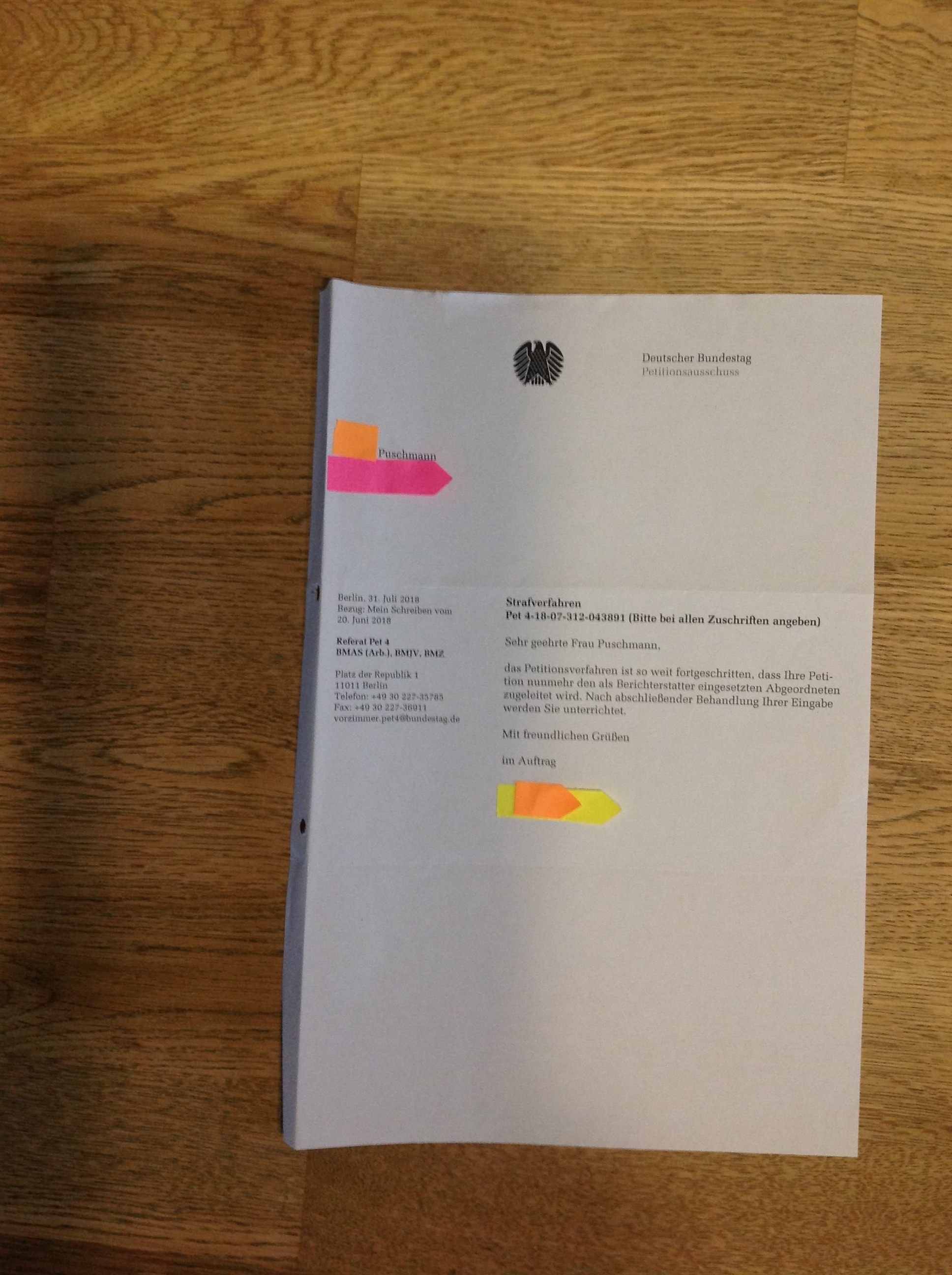 Das Petitionsverfahren ist soweit fortgeschritten, dass die Petition an den als Berichterstatter eingesetzten Abgeordneten zugeleitet wird. Nach Abschliessender Behandlung wurde Unterrichtung zugesagt. Schreiben vom 31.7.2018. Pet- 4-18-07-312-043891