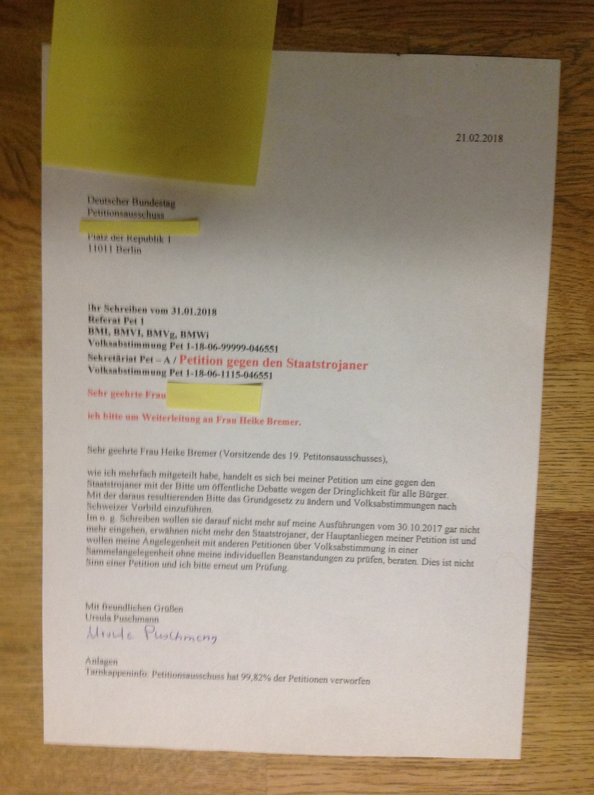 aufgrund meines Schreibens an die Vorsitzende des Petitionsausschusses Heike Brehmer wurde nun bemerkt das es sich um eine Petition gegen den Staatstrojaner handelt. Eine Prüfung der Petitionsakte hat ergeben, dass es aufgrund eines Büroversehens bedauerlicherweise unterblieben ist auf meine Ausführungen gegen die Staatstrojaner einzugehen.