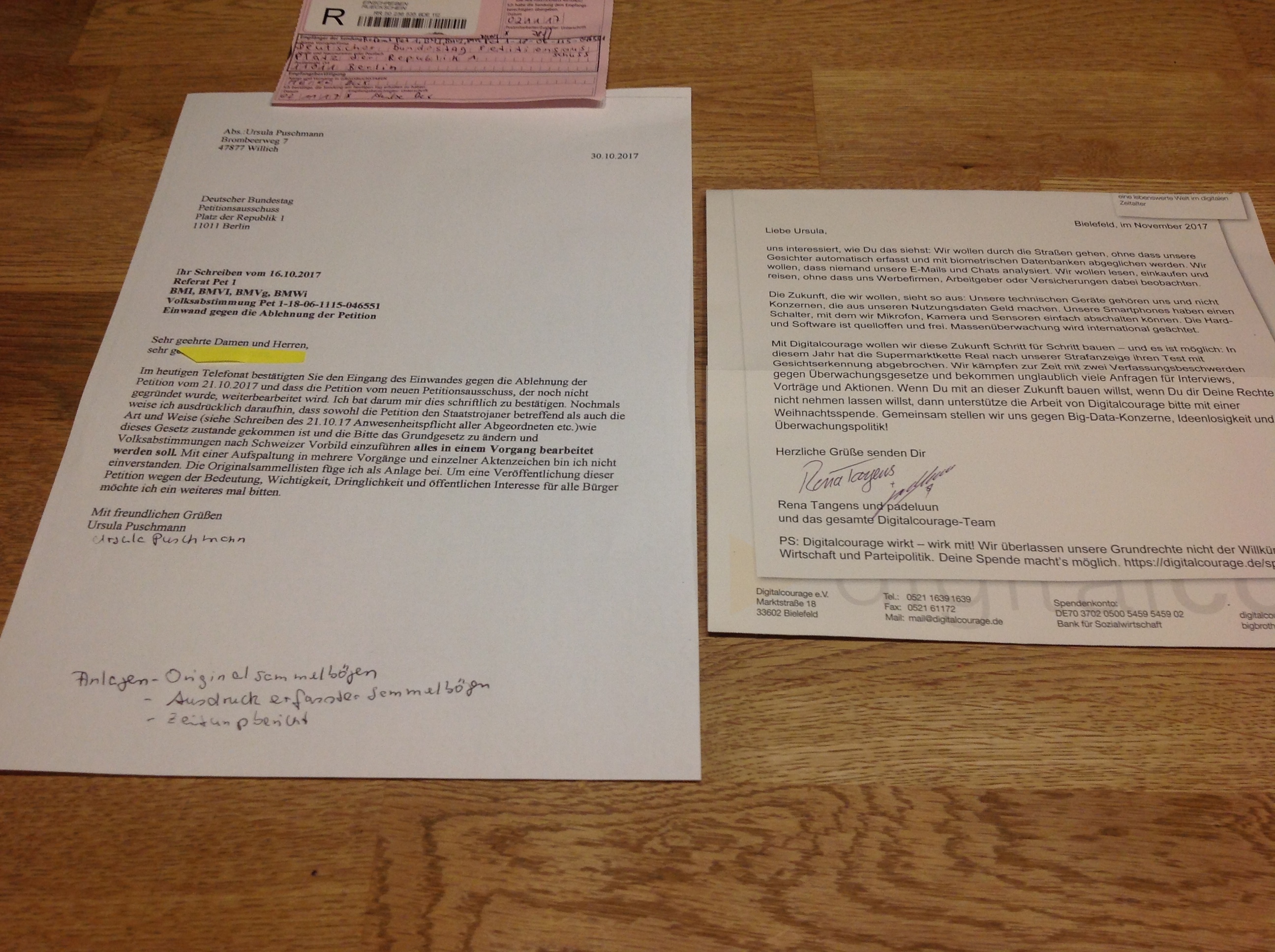 Hier der Stand der Petition.Es hat sich durch die politische Situatiion in den letzten Wochen (Verzögerung einer neuen Regierungsbildung ) noch nichts weiter getan. Ich kann nur viele Menschen bitten, die gegen die Überwachung sind, den Verein Digitalcourage mit einer finanzielle Spende zu unterstützen, da Digitagcourage noch sammelt und dann gegen den Staatstrojaner klagen will, weil diese Grundrechtsverletzung verfassungswidrig ist. Ich wünsche Euch allen eine schöne Adventszeit, ein gesegnetes frohes Weihnachtsfest und ein glückliches neies Jahr.