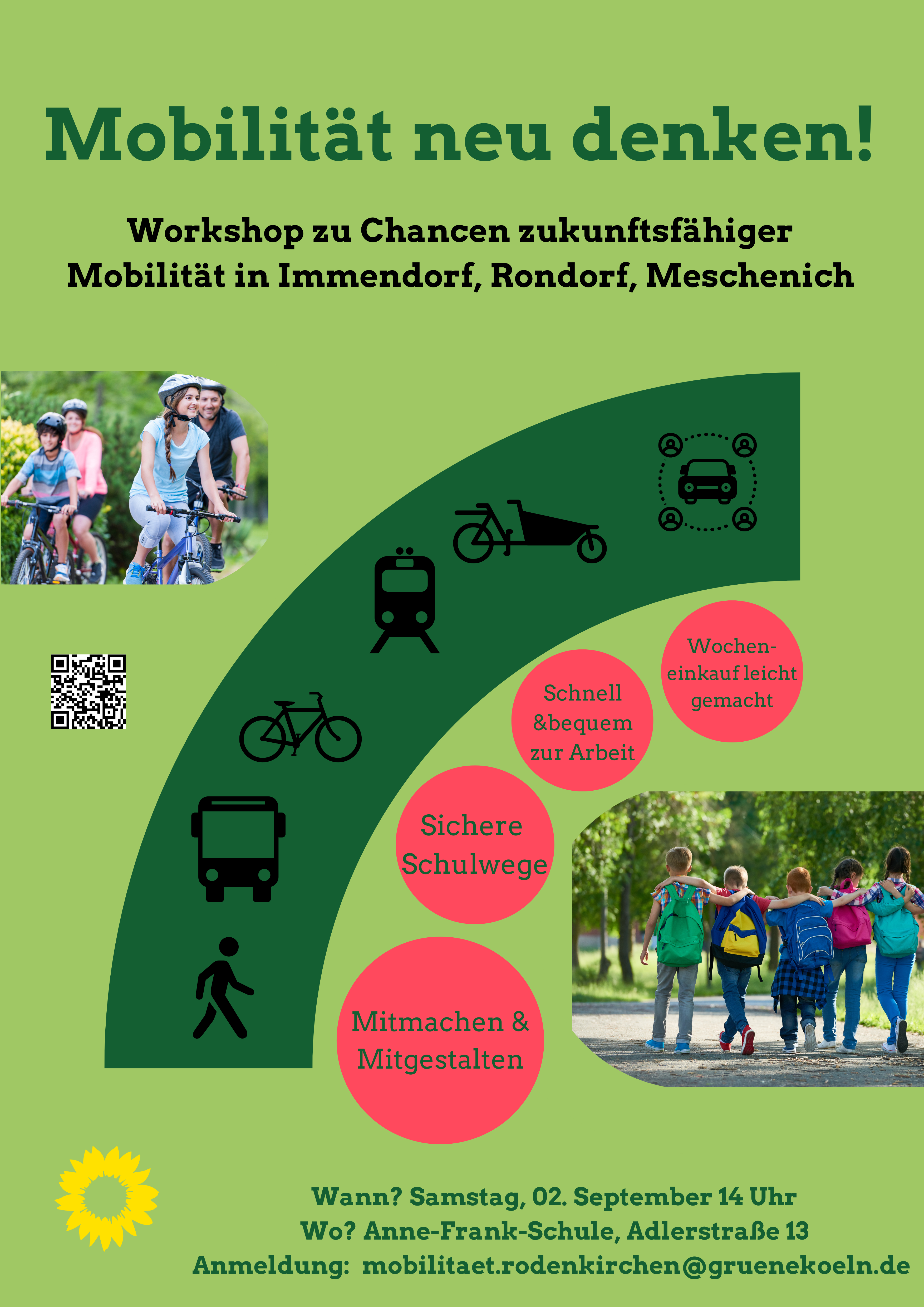 Am Samstag, 2. September gibt es den Workshop "Mobilität neu denken" für Immendorf, Meschenich und Rondorf, wo Bürger:innen Vorschläge zur Verbesserung der Infrastruktur jenseits des Autos einbringen können: 14:00 Uhr Grundschule Rondorf, Adlerstraße.