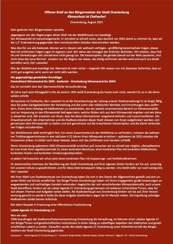 Hinweisen möchte ich auch noch auf das Einlegeblatt in der aktuellen Ausgabe des Märker, in der die Lokale Agenda 21 einen offenen Brief an die Stadt Oranienburg richtet, der sehr gut zu unserem Anliegen passt. So ist es gut zu sehen, dass es viele Menschen gibt, denen die nachhaltige Entwicklung unserer Stadt ein Anliegen ist. Herzlich, Henning Schluß