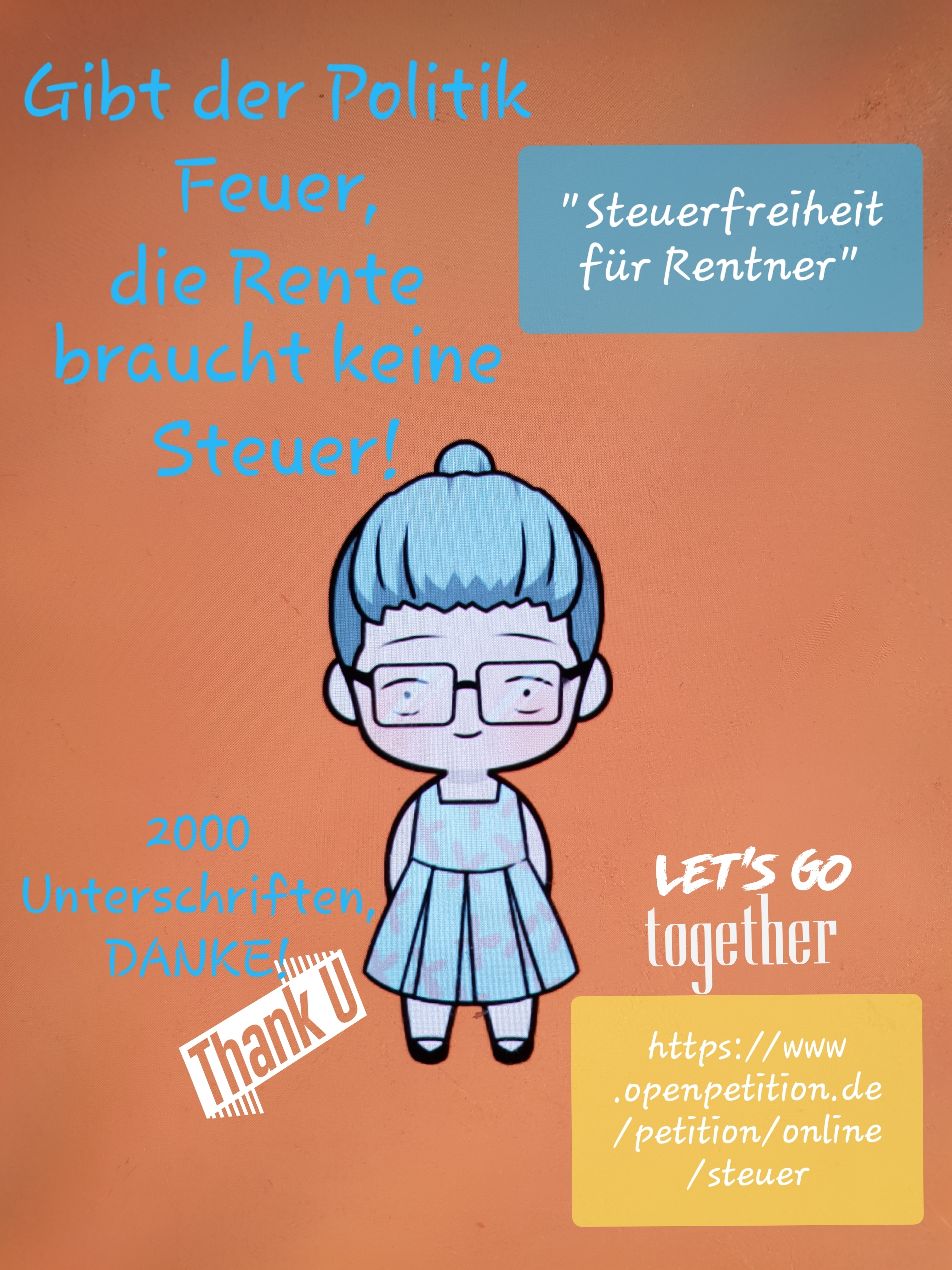 Um den Steuerwahnsinn entgegen zu wirken, haben wir eine Petition "Steuerfreiheit für Rentner" erstellt, um den menschenunwürdigen verfassungswidrigen Umgang entgegenzuwirken und unsere Rentner, sowie deren Nachkommen vor weiterer Mehrfachbesteuerung und Altersarmut zu bewahren. Es ist unverantwortlich, dass die Politik tausende Rentner in aufwendigen Klageverfahren zwingt. Deshalb setzen Sie ein ein Zeichen und UNTERZEICHNEN und TEILEN Sie unsere Petition, vielen Dank.
