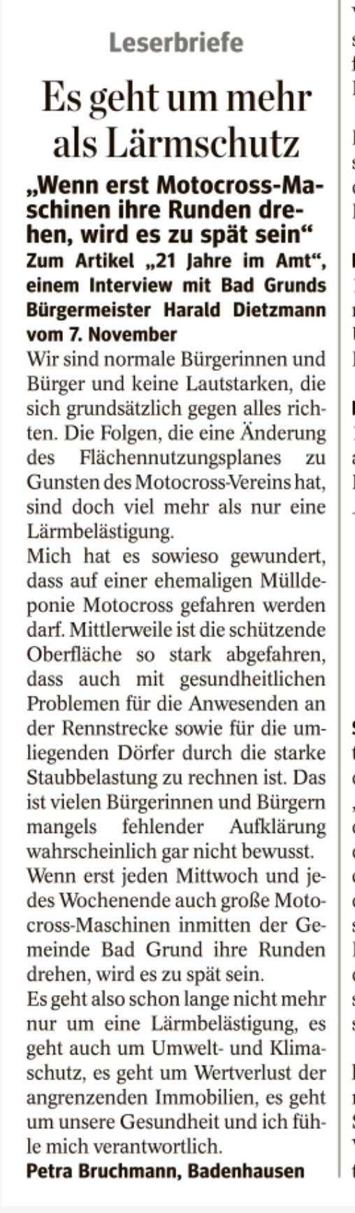 Stellungnahme Bürgermeister Dietzmann zur Frage „Wie stehen sie zur aktuellen Diskussion um das Thema Motocross”. So denkt unser Bürgermeister über Bürger der Gemeinde Bad Grund, die sich für Bewohner der Gemeinde Bad Grund einsetzen. Er bezeichnet sie als lautstark. Dagegen wurde ein passender Leserbrief am Freitag, 11.11.2022 im Harzkurier veröffentlicht