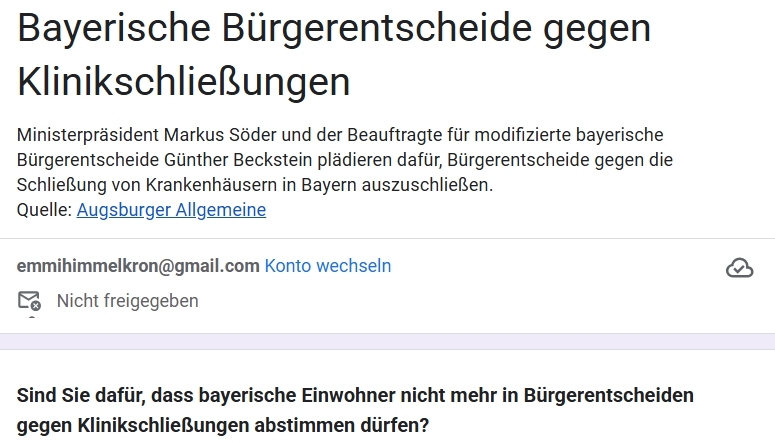 Wir informieren über folgenden nichtöffentlichen Brief an Bundesgesundheitsministerin Warken zwecks Abschaffung des bundesweiten Klinikatlas, fast wortgleich mit gestrigen Pressemitteilung. Das Ziel: 1) Den Druck zur Abschaffung des Klinikatlas von Ex- Bundesforschungsminister Karl Lauterbach erhöhen 2) Die Aktionsgruppe Schluss mit Kliniksterben in Bayern mit ihrer umfassenden Projektstudie zum Krankenhaustransparenzgesetz und einem transparenten kostenfreien Klinikatlas "Kliniken in Gefahr" bei Warken als ernst zu nehmendes klinisches Fachgremium profilieren.