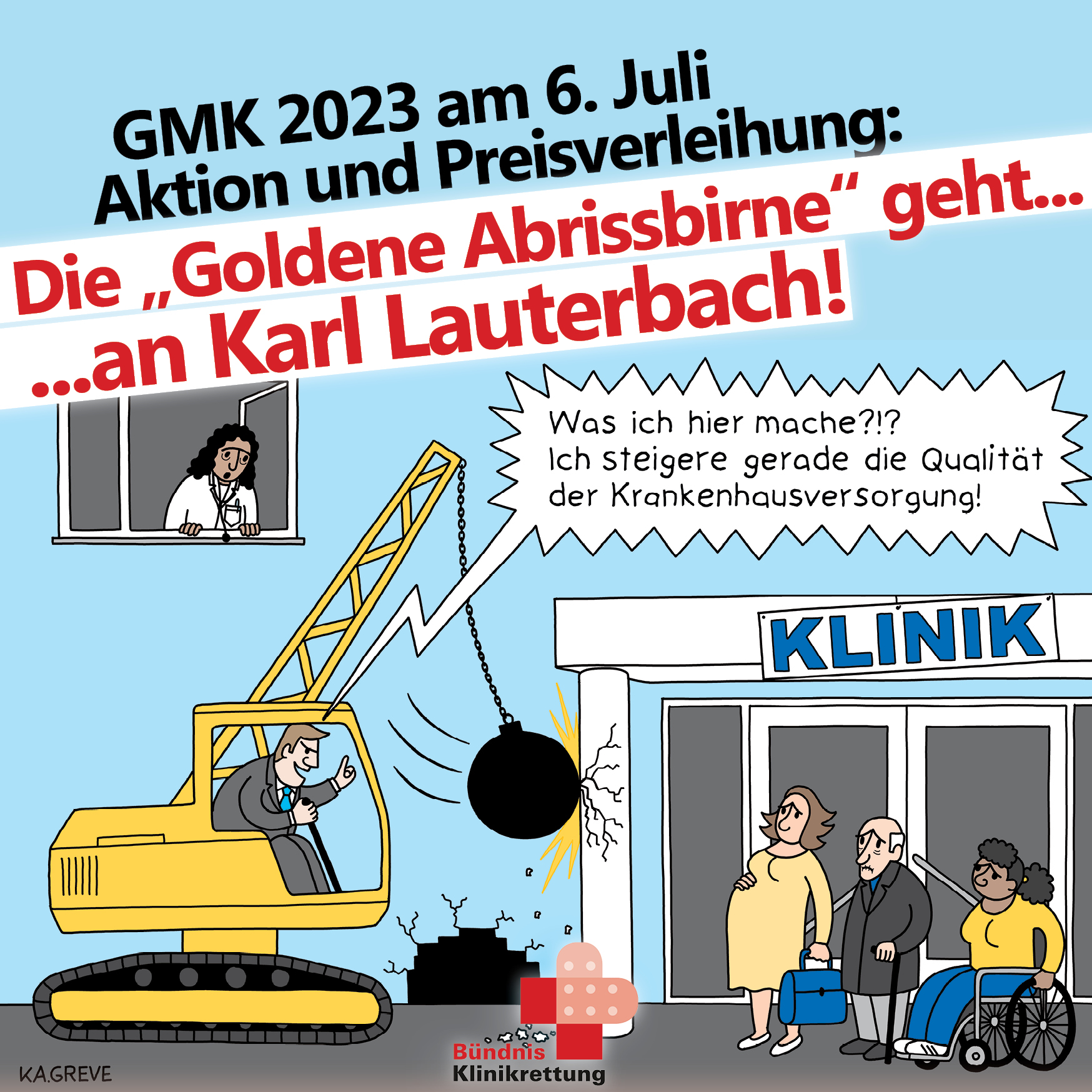 Dieses schlimme Ergebnis des Reformprozesses ist keine Überraschung, denn die Betroffenen – die örtliche Bevölkerung, Beschäftigte und VertreterInnen kleiner Allgemeinkrankenhäuser – wurden überhaupt nicht einbezogen! Dagegen wollen wir protestieren: mit einer lautstarken Kundgebung und der Verleihung unseres Schmähpreises für Klinikschließer, der „Goldenen Abrissbirne“, an Karl Lauterbach.