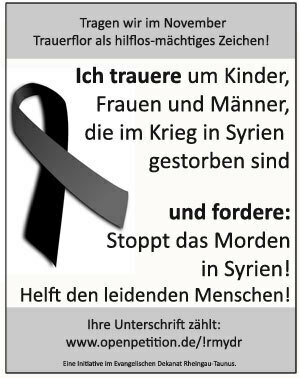 Lasst Im November wurde dazu aufgerufen, Trauerflor als Zeichen zu tragen. Im Dezember möchten wir weiter daran erinnern, dass das Morden in Syrien unvermindert weitergeht. Gerade im Monat Dezember, in dem viele von uns im November Trauer tragen: Ein Trauerflor am Arm. Egal wo. Privat. Öffentlich. In der Schule. Am Arbeitsplatz. In der Kirche. Wir setzen ein hilflos-mächtiges Zeichen. ihre Zeit mit Familie und Freunden verbringen und in dem Weihnachten als Fest des Friedens gefeiert wird, wollen wir weiter an die Kinder, Frauen und Männer in Syrien erinnern, die Tag für Tag dem mörderischen Krieg ausgeliefert sind.