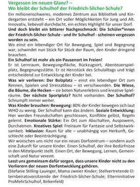 Zudem wurde uns mitgeteilt, dass wohl leider nicht mehr genügend Geld für die Gestaltung des neuen, sehr kleinen Restpausenhofs übrig sei. Das Spendensammeln dafür überlässt man wiederrum dem Engagement des Elternbeirats und Fördervereins. Das ist aus meiner Sicht den Kindern gegenüber doppelt unfair. Zuerst entfernt man alles, was schön war und sorgt danach nicht einmal dafür, dass das Minimum an Platz für die Kinder ansprechend gestaltet wird. Warum bekommt die neue Bibliothek Millionen und der Pausenhof ist dann „zu teuer“? Wir als Elternbeirat und ich persönlich haben versucht, Gespräche zu führen und Gehör zu finden. Doch die Gemeinde scheint derzeit auf die Bedürfnisse und Wünsche der Kinder und Eltern nicht einzugehen und „stur“ ihren Plan durchzuziehen. Stattdessen werden während der Gespräche durch schnelle Beschlüsse Nägeln mit Köpfen gemacht. Mein momentanes, subjektives Fazit ist: Die Kinder der Silcherschule scheinen der Gemeinde weder genügend Platz noch genügend Geld für eine Pausenhofausstattung wert zu sein.