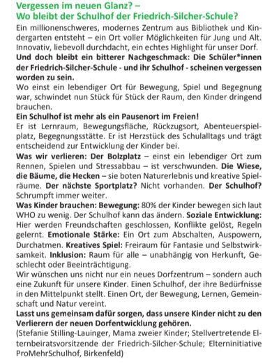 Innovativ, liebevoll durchdacht, ein echtes Highlight für unser Dorf. Und doch bleibt ein bitterer Nachgeschmack: Die Schüler*innen der Friedrich-Silcher-Schule - und ihr Schulhof - scheinen vergessen worden zu sein.