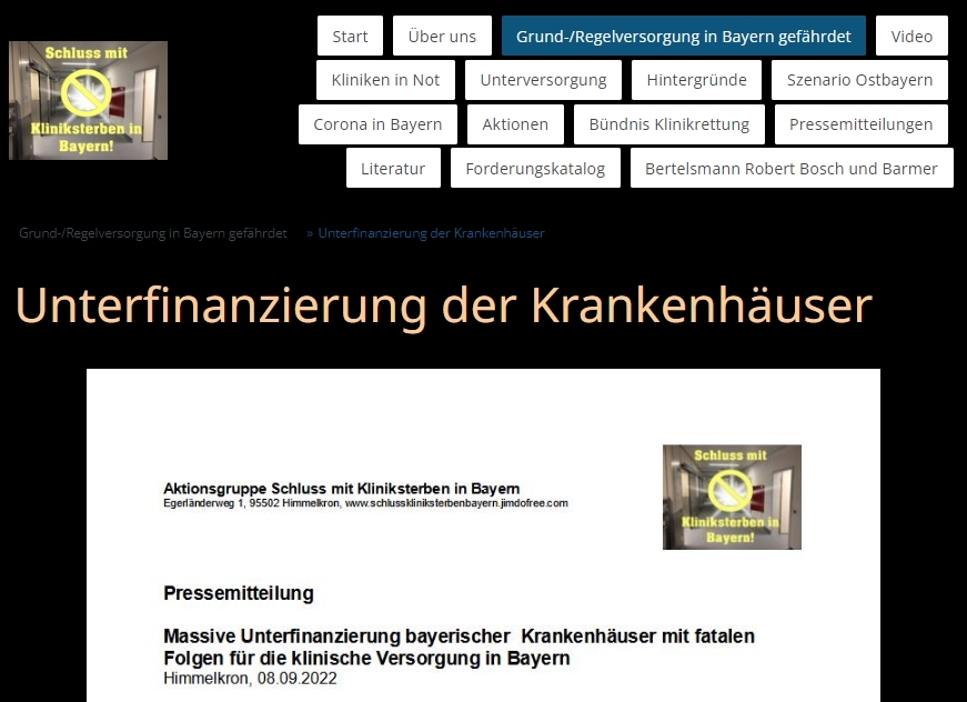 „Die deutschen Krankenhäuser sind in Gefahr. Die Personalnot wird immer größer. Rund 60 % der Krankenhäuser machen bereits Verluste. … Die Bundesregierung muss jetzt handeln und dringend einen Inflationsausgleich für die Krankenhäuser auf den Weg bringen, ansonsten zwingt sie die Krankenhäuser zu flächendeckendem Personalabbau. Gemeinsam mit den Krankenhäusern muss die angekündigte Reform der Krankenhausversorgung und des Finanzierungssystems auf den Weg gebracht werden.“ *1) Die Aktionsgruppe Schluss mit Kliniksterben in Bayern schleißt sich dieser Aufforderung an. Sie wird auch von der Bayerischen Krankenhausgesellschaft unterstützt. *2)