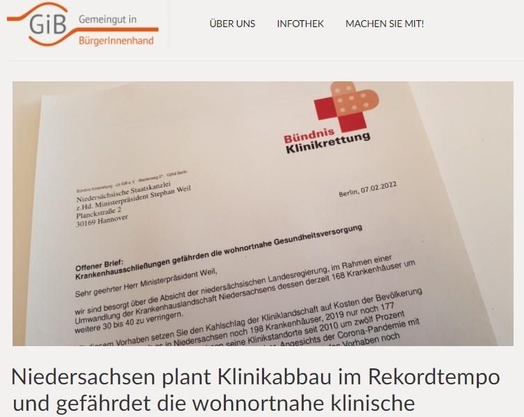 Die niedersächsische Landesregierung plant in einem neuen Gesetzesentwurf die Ausdünnung der Krankenhauslandschaft. Danach sollen 30 bis 40 der derzeit 168 Krankenhäuser Niedersachsens schließen. Das Bündnis Klinikrettung kritisiert, dass die Pläne die wohnortnahe klinische Versorgung gefährden. In einem offenen Brief an Niedersachsens Ministerpräsident Stephan Weil und Gesundheitsministerin Daniela Behrens fordert das Bündnis, die Krankenhausschließungen auszusetzen und alle Krankenhäuser ausreichend zu finanzieren.