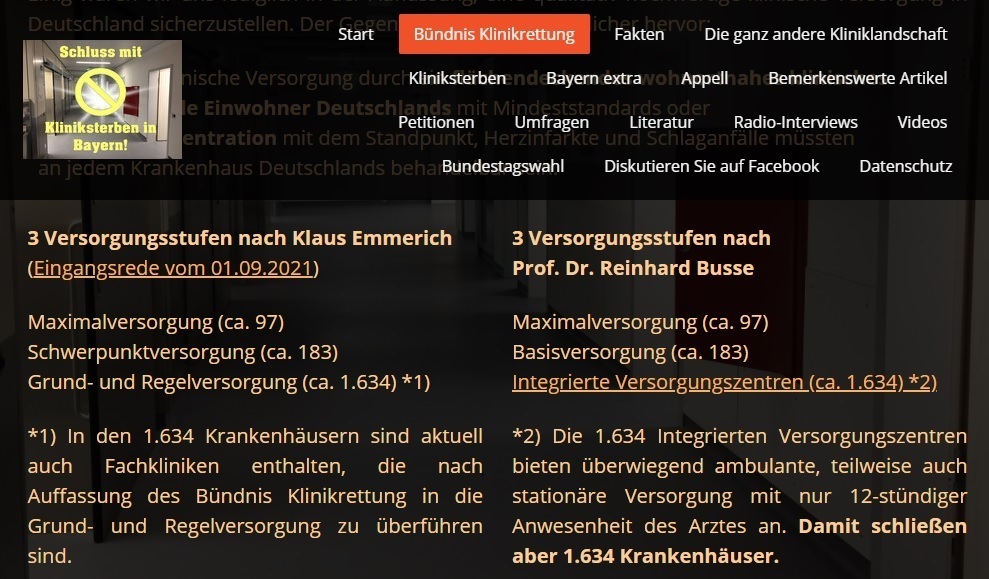 - hochwertige klinische Versorgung durch ein flächendeckendes wohnortnahes klinisches Angebot für alle Einwohner Deutschlands mit Mindeststandards oder