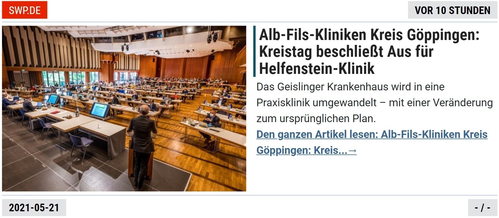 Trotz Corona-Pandemie beschloss der Kreistag von Göppingen am 21.05.2021 die Schließung der Helfenstein-Klinik in Geislingen. Die ist ein Schlag ins Gesicht des Klinikpersonals und auch der Bevölkerung in Geislingen. Die Anfahrzeit zum nächstgelegenen Krankenhaus wird sich signifikant verlängern, die Klinikkapazitäten werden - dem Wunsch der Gesundheitsökonomen entsprechend - weiter verringert.