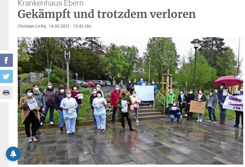 "Rund 30 Beschäftigte der Haßberg-Kliniken Haus Ebern machten am Mittwoch zum Internationalen Tag der Pflegenden auf ihre besondere Situation aufmerksam. Vor dem Hallenbad, gegenüber des Krankenhauses, versammelte sich das Pflegepersonal mit Transparenten und forderte den Erhalt aller Arbeitsplätze in Ebern.