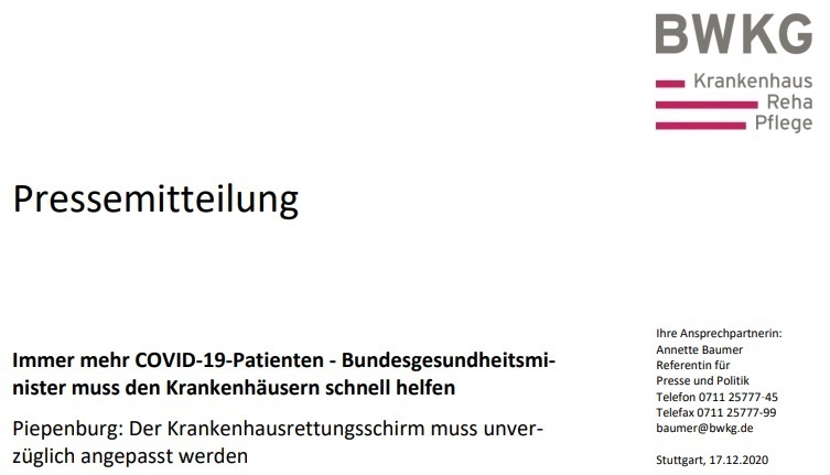 "In der ersten Corona-Welle im Frühjahr hatten alle Krankenhäuser eine Freihaltepauschale erhalten. Diese sei vielleicht etwas zu breit gestreut gewesen. Die jetzige Regelung von der Bundesebene ist aber so restriktiv, dass etwa die Hälfte der Krankenhäuser, die in der ersten Welle im Land die Versorgung der COVID-19-Patienten getragen haben, keine Unterstützung mehr erhalten. ... So sei vorgesehen, dass nur Krankenhäuser der so genannten erweiterten und umfassenden Notfallstufen eine Freihaltepauschale erhalten könnten, wenn in ihrem Land- oder Stadtkreis weniger als 25 % der Intensivbetten frei sind und die Inzidenz über 70 Fällen je 100.000 Einwohner liege. Häuser der Basisnotfallstufe dürften nur bei einer verschärften Notlage und nur nachrangig beauftragt werden. ... Ausgerechnet die SLK Lungenklinik Löwenstein erhält keine Freihaltepauschalen. Grund ist, dass sie keine Notfallstufe hat“, so der BWKGVorstandsvorsitzende, der gleichzeitig Landrat des Kreises Heilbronn und stellvertretender Aufsichtsratsvorsitzender der SLK-Kliniken ist. „Außerdem konterkarieren die Bundesvorgaben die Bemühungen des Landes, die Belastungen der zweiten Welle auf möglichst viele Schultern zu verteilen. Die Mitarbeiter in den Kliniken sind nach neun Monaten Krise zunehmend erschöpft und die Belegschaften durch Krankheitsfälle ausgedünnt. Auch deshalb wurde im Land ein regionales Versorgungskonzept entwickelt. Das Konzept mit sechs Versorgungsregionen, in denen sich die Häuser gegenseitig helfen, kann aber