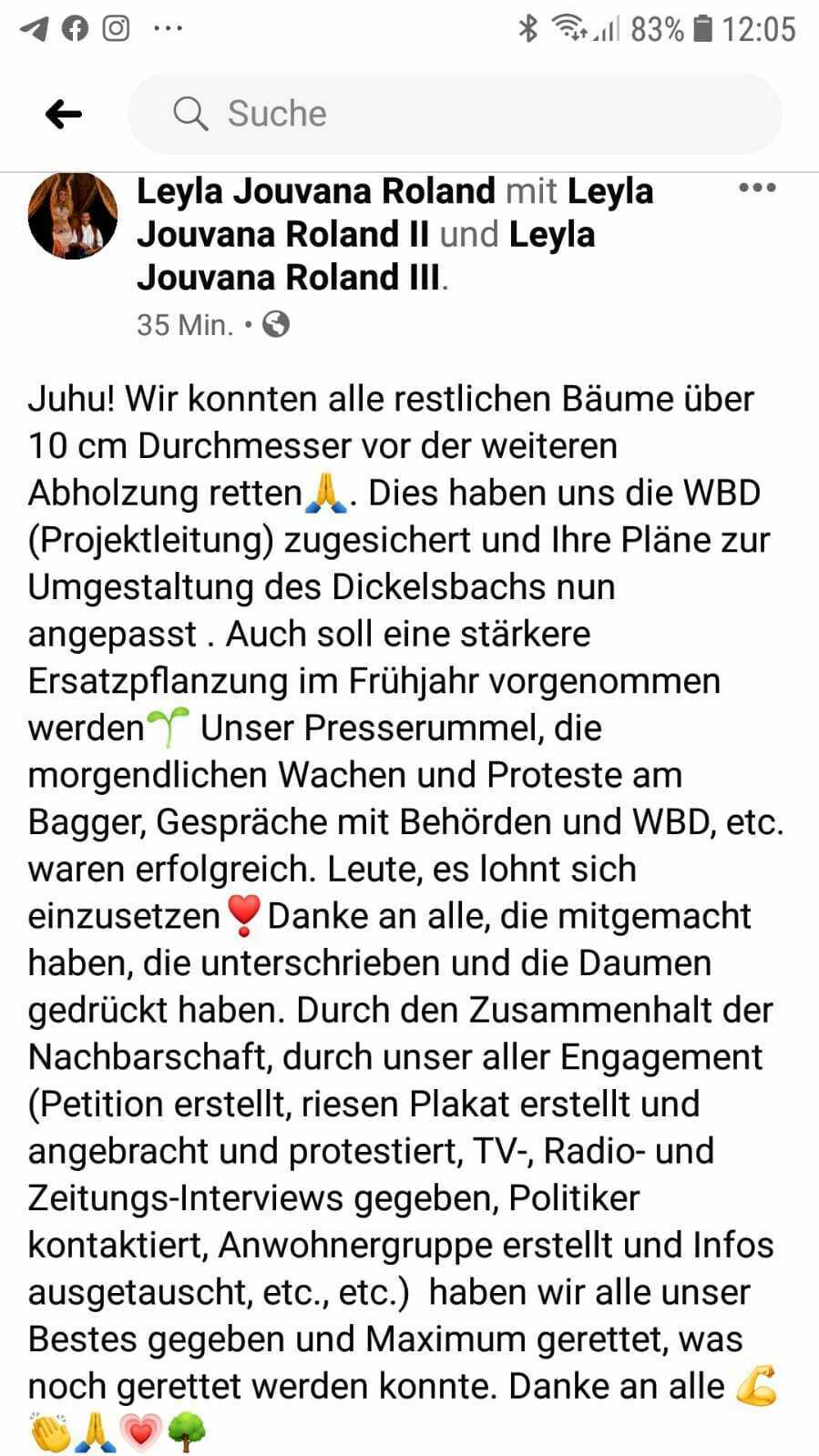 Heute Vormittag (19.10.) konnte die weitere Abholzung gestoppt werden. Einige Nachbarn konnten den Bagger morgens um 8 an der Weiterarbeit hindern.