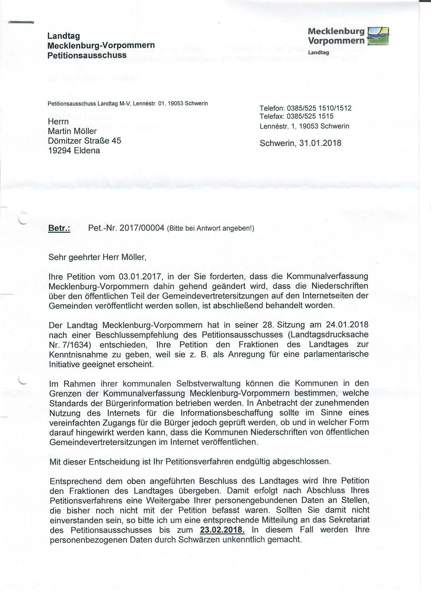 Der Petitionsausschuss hat mit Schreiben vom 31.01.2018 mitgeteilt, dass die Petition an die Fraktion der Landtage weitergeleitet wird. Ich werde Kontakt zu den Fraktionen aufnehmen, damit unsere Bemühungen auch ein Erfolg werden! Vielen Dank für die bisherige Unterstützung!