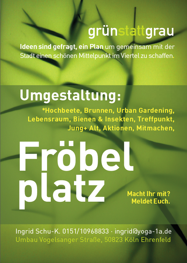 Der Fröbelplatz soll umgestaltet werden um Urban Gardening zu ermöglichen und mehr Grün zu schaffen und Verbesserungen bringen. Hier gab es Treffen mit der Stadt, leider verzögert es sich, weil die Ämterzuständigkeit nicht geklärt ist. Deswegen: auch wenn ihr euch gemeldet habt um mitzuwirken, das ist nicht vergessen, nur leider verzögert sich alles.
