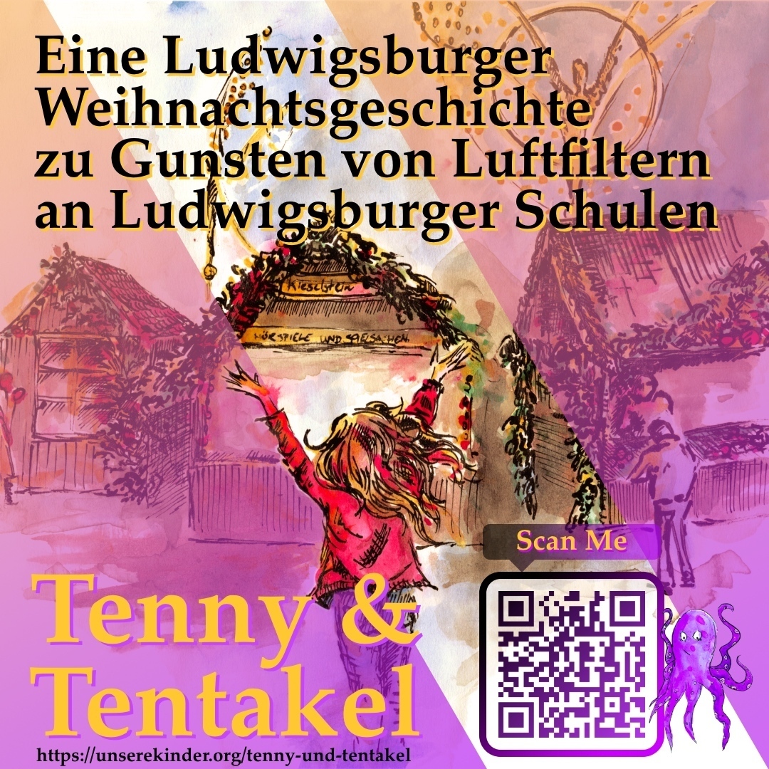 In der Erzählung „Tenny und Tentakel – eine Ludwigsburger Weihnachtsgeschichte“ geht es um das Mädchen Tenny. Sie besucht mit ihren Eltern den Ludwigsburger Weihnachtsmarkt und gewinnt dort beim Dosenwerfen. Als Preis sucht sie sich eine lilafarbene, flauschige Stoffkrake aus. Schnell merkt sie, dass das kein gewöhnliches Kuscheltier ist. Die Krake kann nämlich sprechen, heißt Tentakel und ist ziemlich eigensinnig. Sie sieht total niedlich aus – wäre aber viel lieber wild und gefährlich. Gemeinsam erleben Tenny und Tentakel eine Vorweihnachtszeit der besonderen Art.