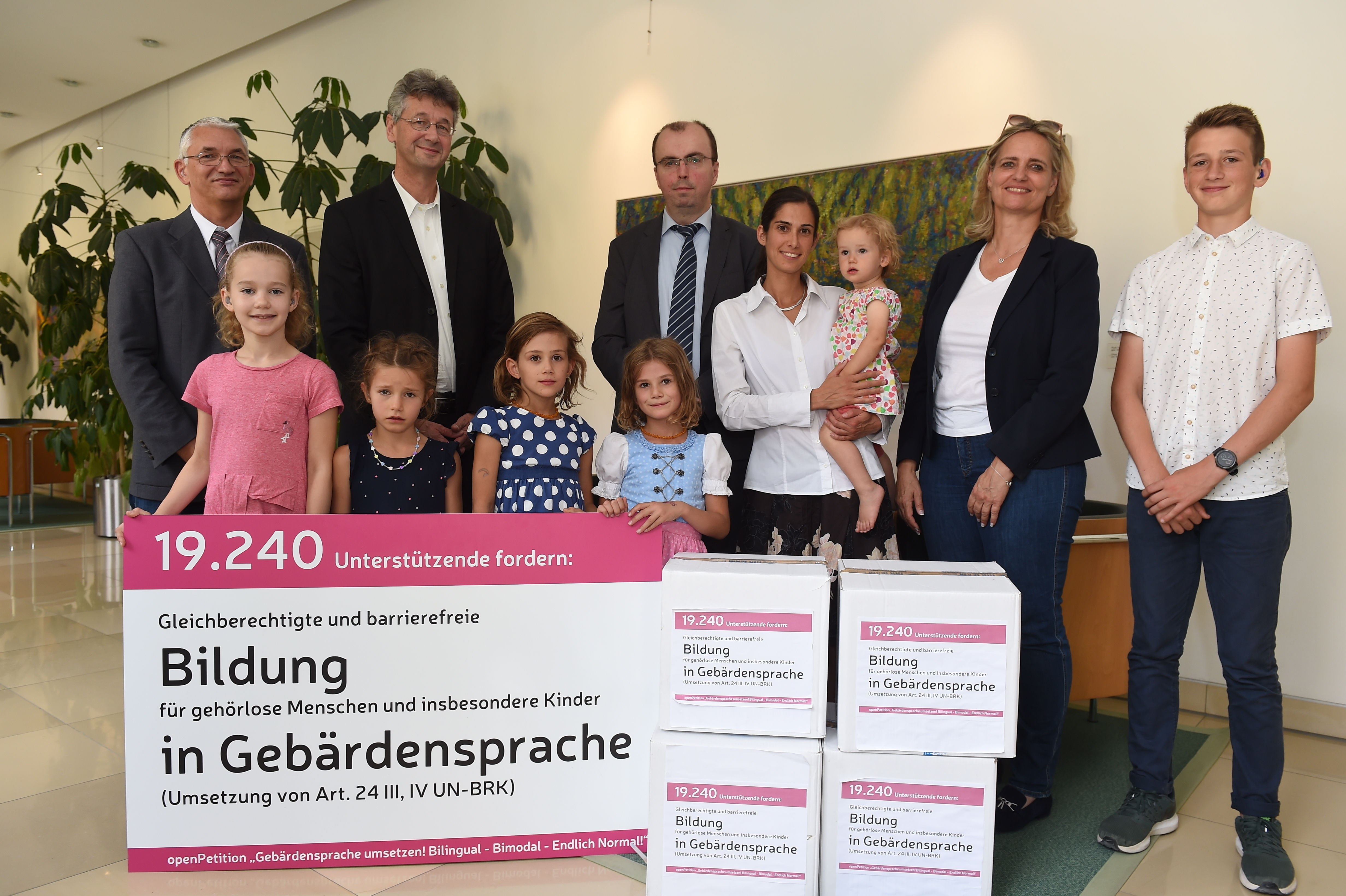 München, 19.07.2019. Die Vereinigung der Eltern hörbehinderter Kinder in Bayern e.V., der Gehörlosenverband München und Umland e.V. und der Landesverband Bayern der Gehörlosen e.V. haben am gestrigen Donnerstag (18. Juli 2019) eine Petition zur Umsetzung der Gebärdensprache auf allen Ebenen des Bildungswesen an den Bayerischen Kultusminister Prof. Dr. Michael Piazolo (FW) übergeben.