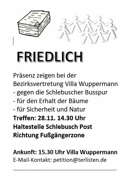 Wir möchten uns am 28.11. um 14.30 Uhr an der Haltestelle Schlebusch Post treffen, um gemeinsam FRIEDLICH zur Villa Wuppermann zu gehen, wo um 15.45 Uhr die Unterschriftenübergabe erfolgt und anschließend dieses Thema mit 5 Tagesordnungspunkten (u. a. Bürgeranträge und auch Ratsanträge) in der Bezirksvertretung beraten wird.