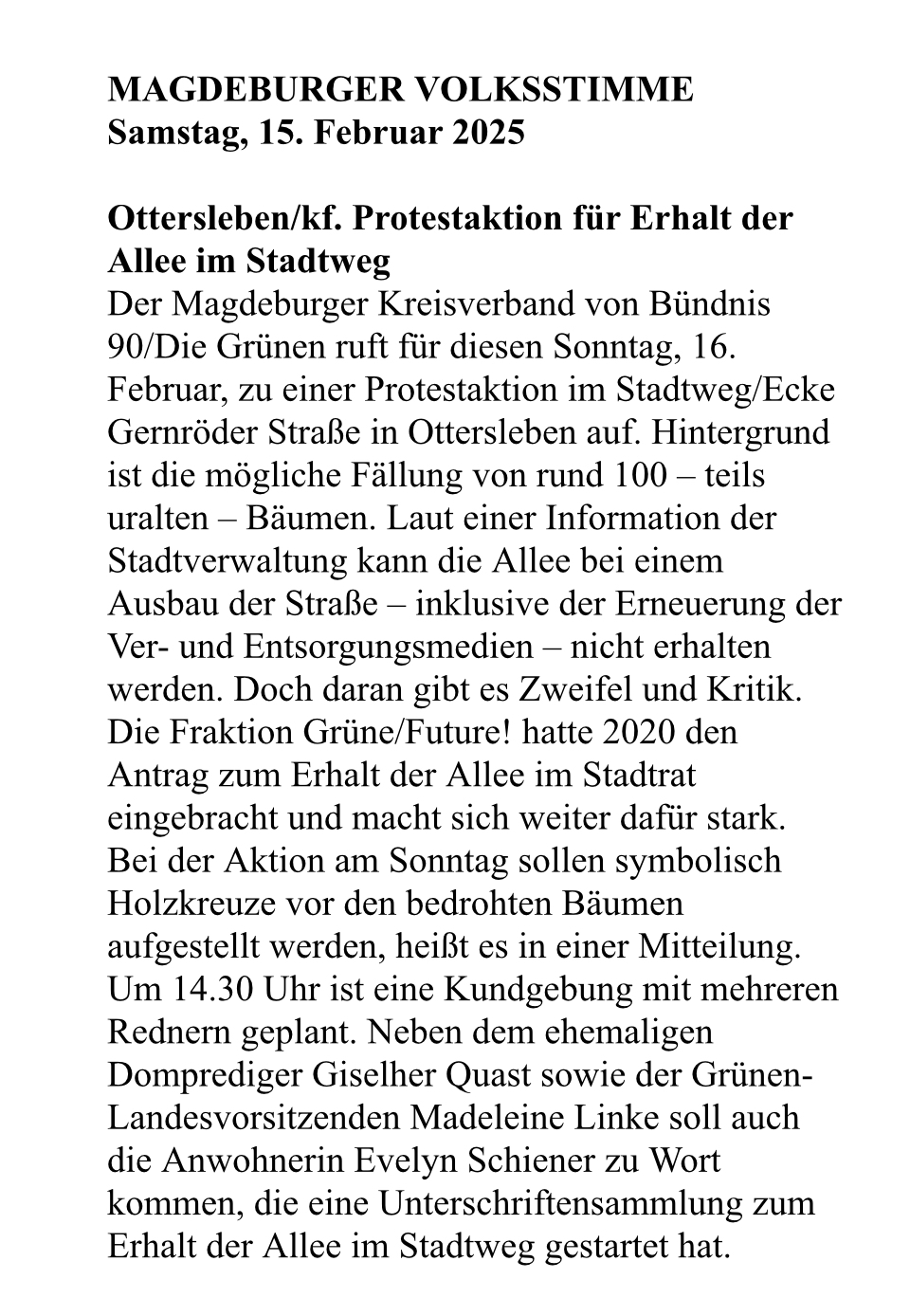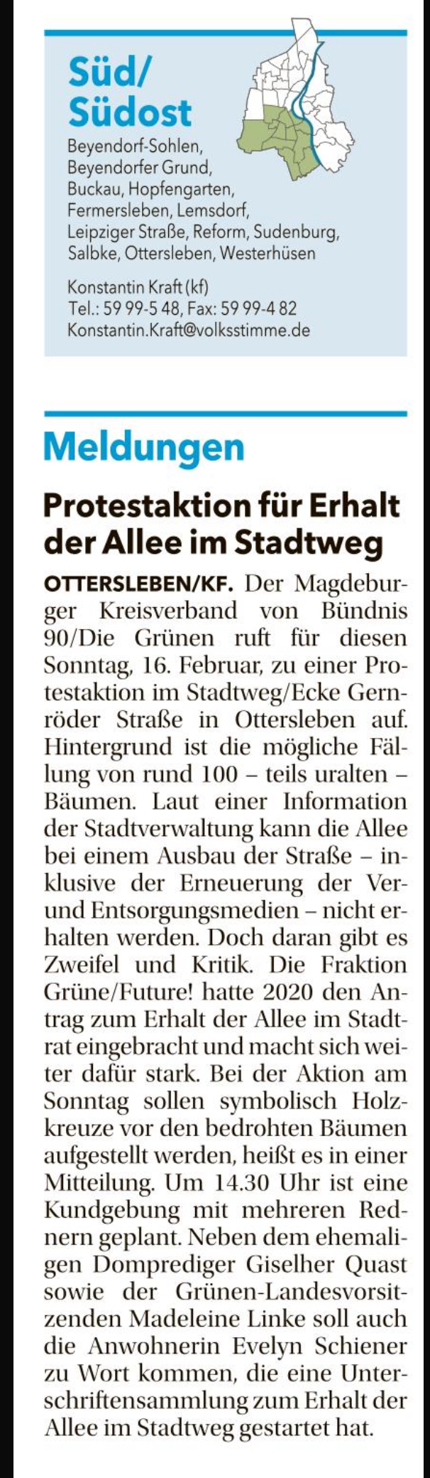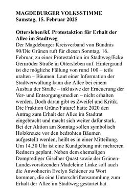 Sehr geehrte Damen und Herren, zuerst möchte ich mich sehr herzlich bedanken, dass Sie die Petition unterschrieben haben und damit dazu beitragen möchten, die Allee in Ottersleben zu erhalten.