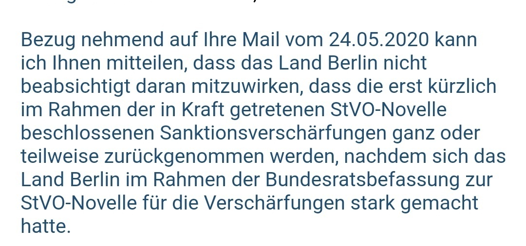 Ansonsten gilt weiterhin die Bitte: Kontaktiert eure Verkehrsminister mit diesem Anliegen , weißt auf die Gefahr von Geschwindkeitsüberschreitungen hin, bitte um entsprechenden Druck im Bundesrat.
