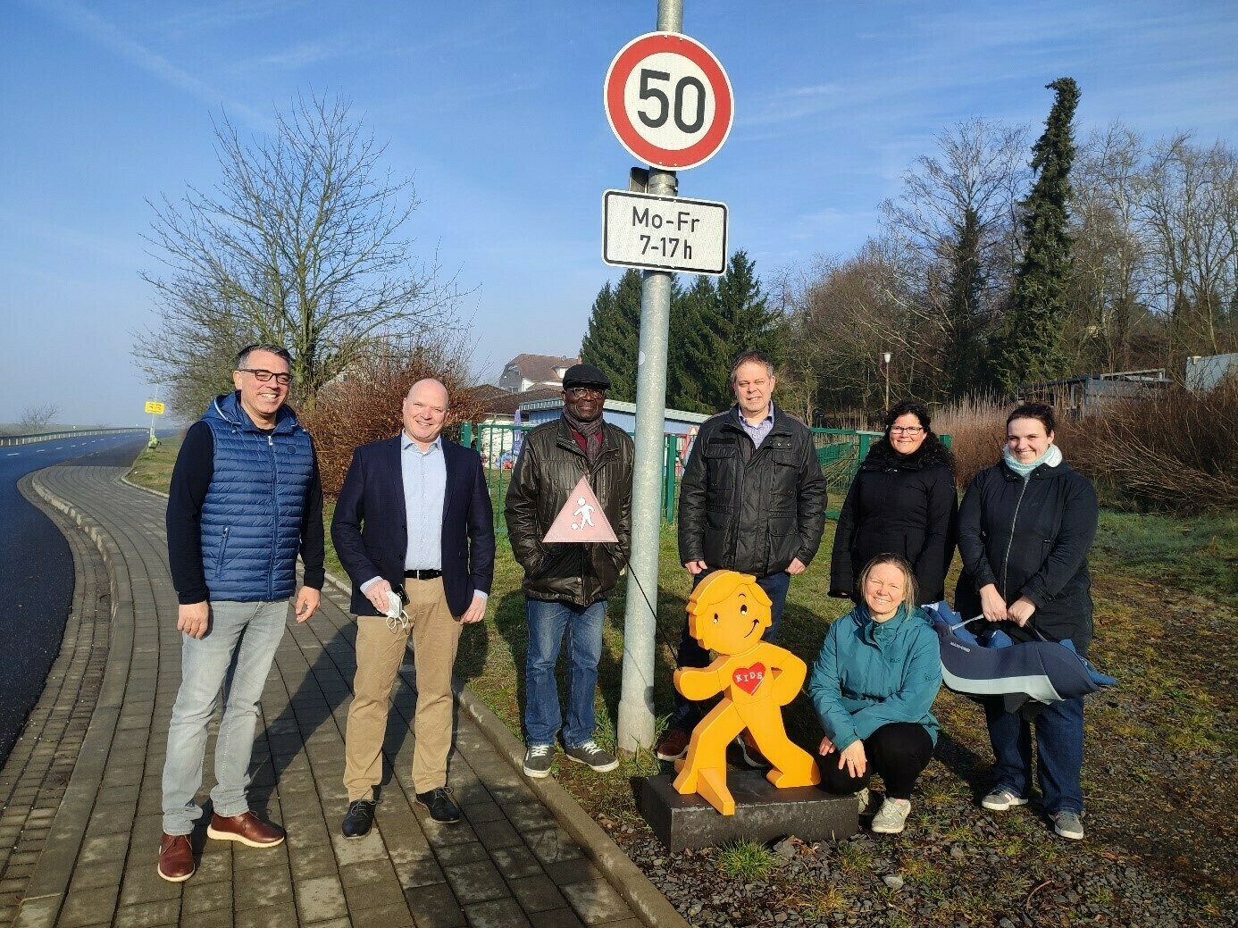 Aus diesem Anlass trafen sich am 16.03.2022 die Beteiligten, um die Schilder offiziell in Empfang zu nehmen. Der Elternbeirat bedankte sich im Namen aller für die schnelle und unproblematische Umsetzung der Forderung einer Geschwindigkeitsreduktion bei Herrn Zuckermann (Hauptamtlicher Kreisabgeordneter). Auch Bürgermeister Thomas Benz bedankte sich beim Landkreis, mehrere Jahre versuche er schon eine Geschwindigkeitsreduzierung zu erlangen, alles unter 100 km/h wäre ein Erfolg gewesen, aber die 50 sind einfach super, so Benz. KITA Leitung Michaela Damm schloss sich ihren Vorrednern an und fügte dem noch bei, dass bereits in der vergangenen Woche der Lärmpegel auf dem Außengelände hörbar nachgelassen hätte. Dies sei ein Qualitätsgewinn für die Kinder und Mitarbeiter*innen. Ein weiterer Gewinn sei zudem, dass mittlerweile keine parkenden Autos mehr auf der Landstraße seien, die dort ihre Kinder ein- oder aussteigen liesen. Herr Zuckermann teilte die Freude und bestätigte, dass er ebenfalls froh sein, dass es nun nach langer Zeit geklappt hat. Zwei Aspekte seien ausschlaggebend gewesen, die Gefahrenlage der KITA an der Landstraße und die Zufahrt zur KITA für die Essensversorgung. Zuckermann betont, wie wichtig die Kommunikation zu dem Thema Verkehrssicherheit ist. Gerade die Schwächeren müssen geschützt werden. Elterntaxis sollten wo möglich vermieden werden, für Kinder ist es wichtig sich zu bewegen und das in einem sicheren Umfeld. Dieses habe man hier geschaffen. In dem Zusammenhang bedankt sich Zuckermann beim Elternbeirat, dass dieser so hartnäckig am Ball geblieben ist. Der Elternbeirat bedankt sich und fügt hinzu, dass allen Unterstützern der Dank gilt, der Elterneirat habe den Anstoß gegeben, aber ohne das mitziehen vieler anderer hätte das Ziel nicht erreicht werden können.