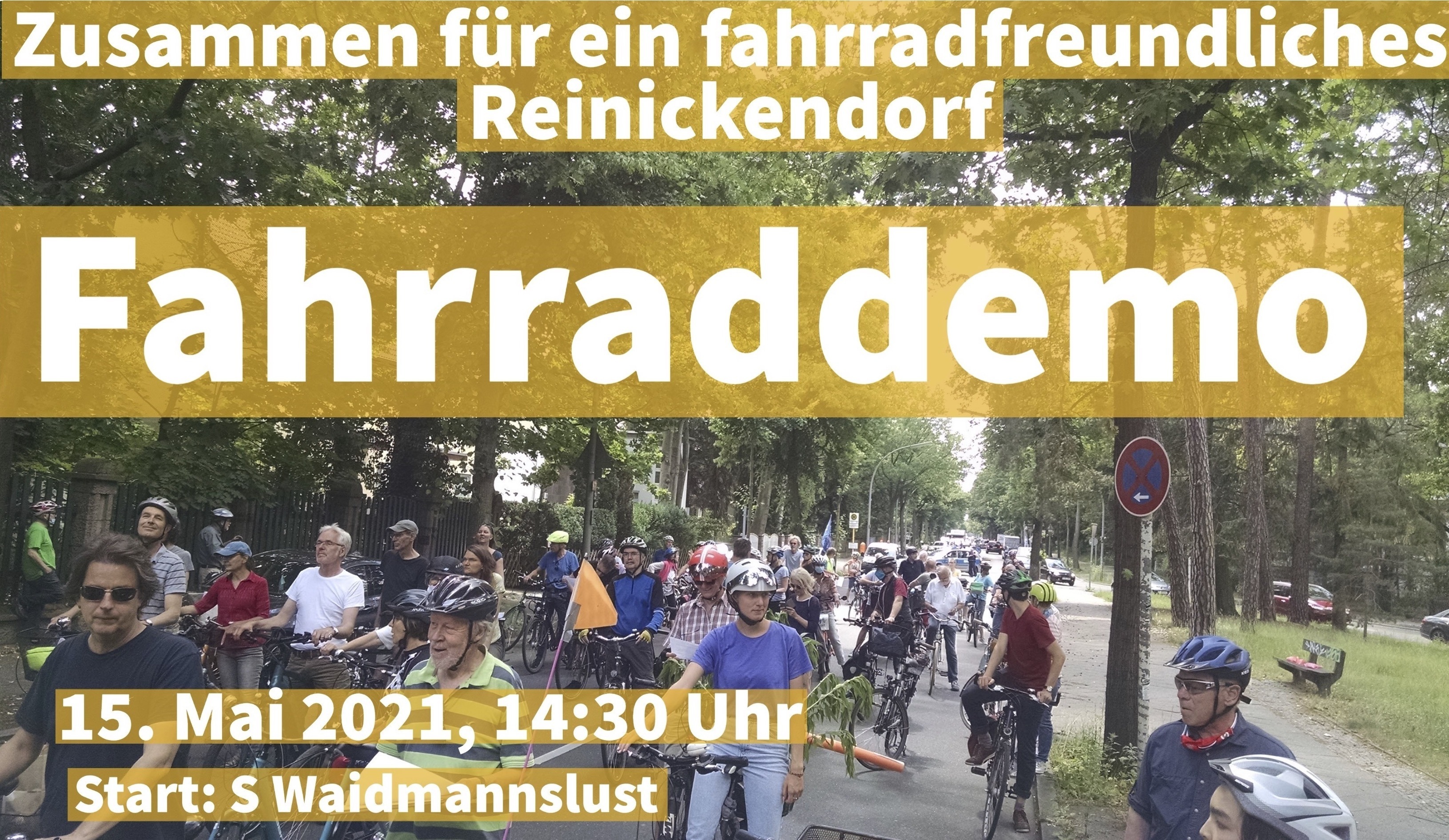 Zusammen mit Changing Cities Reinickendorf, Fridays for Future, dem ADFC Reinickendorf, der BI Waldseeviertel rufen wir gemeinsam zur nächsten Fahrraddemonstration auf. Das Motto: „Mehr Sicherheit für Radfahrer*innen und mehr Ruhe für Anwohner*innen“. Los geht es am Samstag, 15. Mai 2021 um 14.30 Uhr, Start und Ziel ist der S-Bahnhof Waidmannslust.