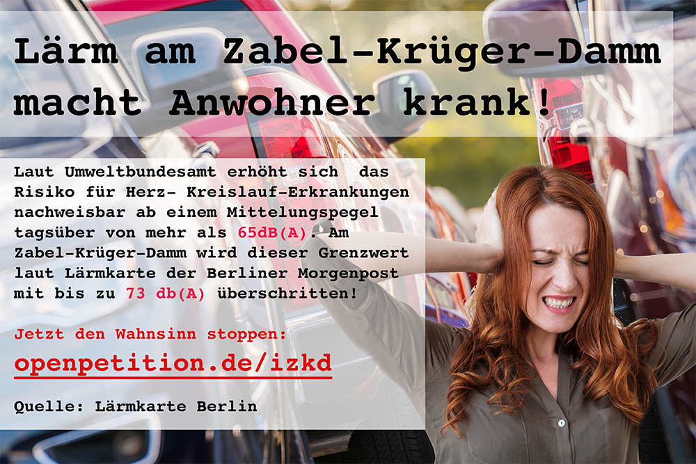 Laut dem Umweltbundesamt erhöht sich das Risiko für Herz- Kreislauf-Erkrankungen nachweisbar ab einem Mittelungspegel tagsüber von mehr als 65dB(A). Am Zabel-Krüger-Damm wird dieser Grenzwert laut Lärmkarte an sehr vielen Punkten überschritten. (Quelle: interaktiv.morgenpost.de/laermkarte-berlin)