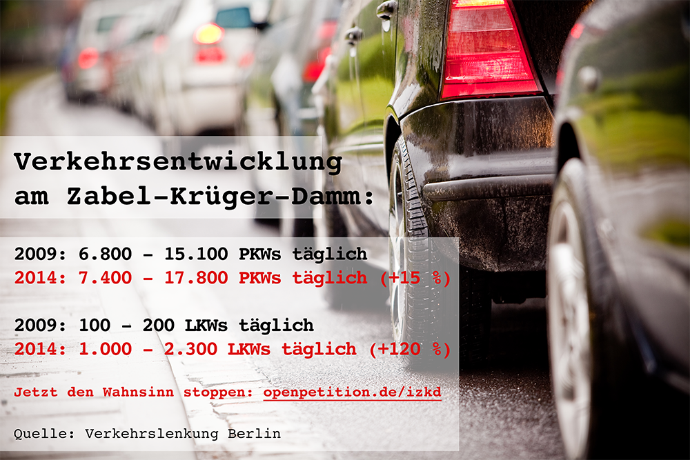 Rund alle fünf Jahre führt die Verkehrslenkung Berlin (VLB) Verkehrszählungen durch. Hieraus werden Hochrechnungen durchgeführt, um die Verkehrsstärke an PKW und LKW pro 24 Stunden zu ermitteln. Auf der Basis der hochgerechneten Verkehrsstärken werden u.a. Emissionskartierungen zu Lärm und Luftverunreinigungen erstellt. Die Zahlen für den Zabel-Krüger-Damm sind erschreckend: