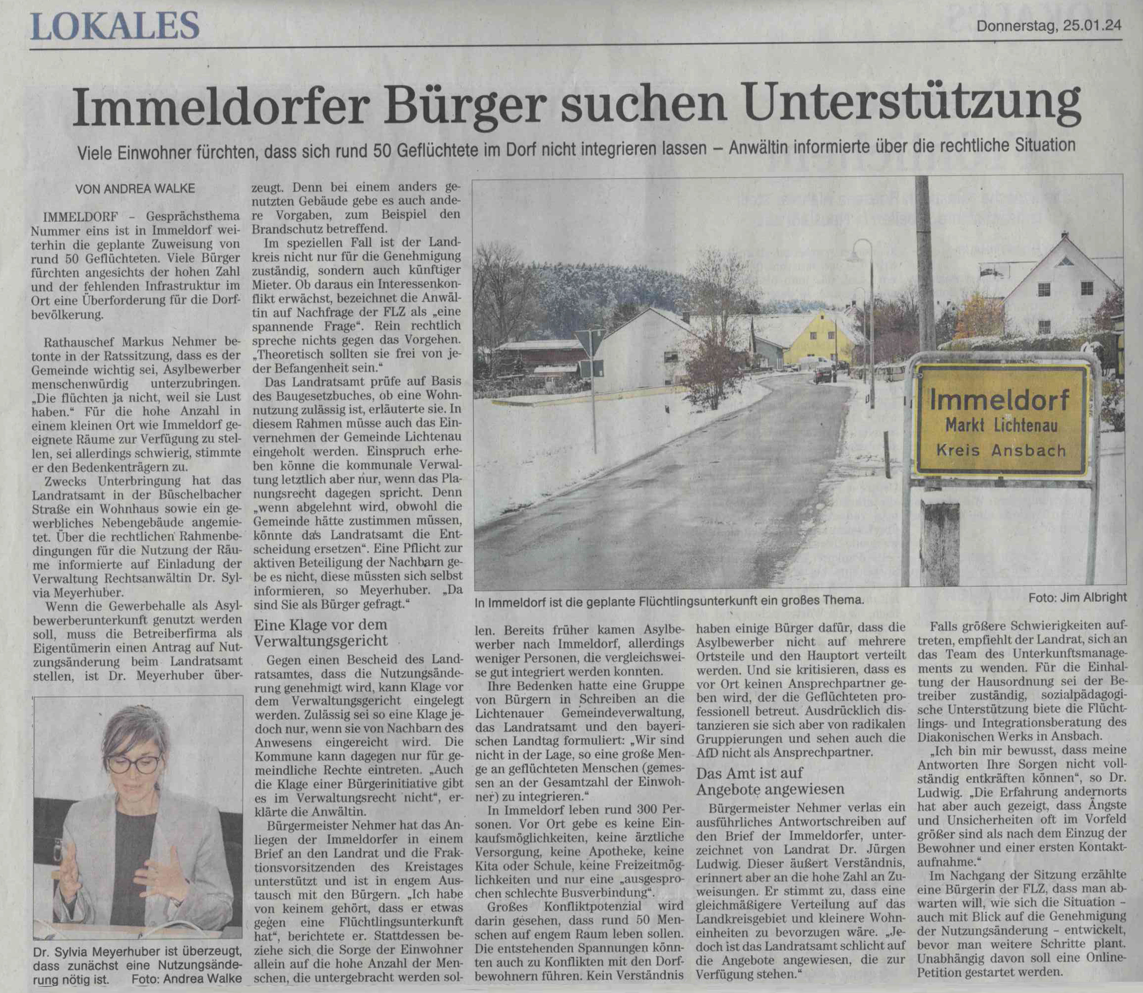 Am 28. November 2023 wurden wir vom Landratsamt Ansbach im Rahmen einer Info-Veranstaltung, über die geplante Unterkunft für 52 geflüchtete Personen in Immeldorf informiert und vor vollendete Tatsachen gestellt.