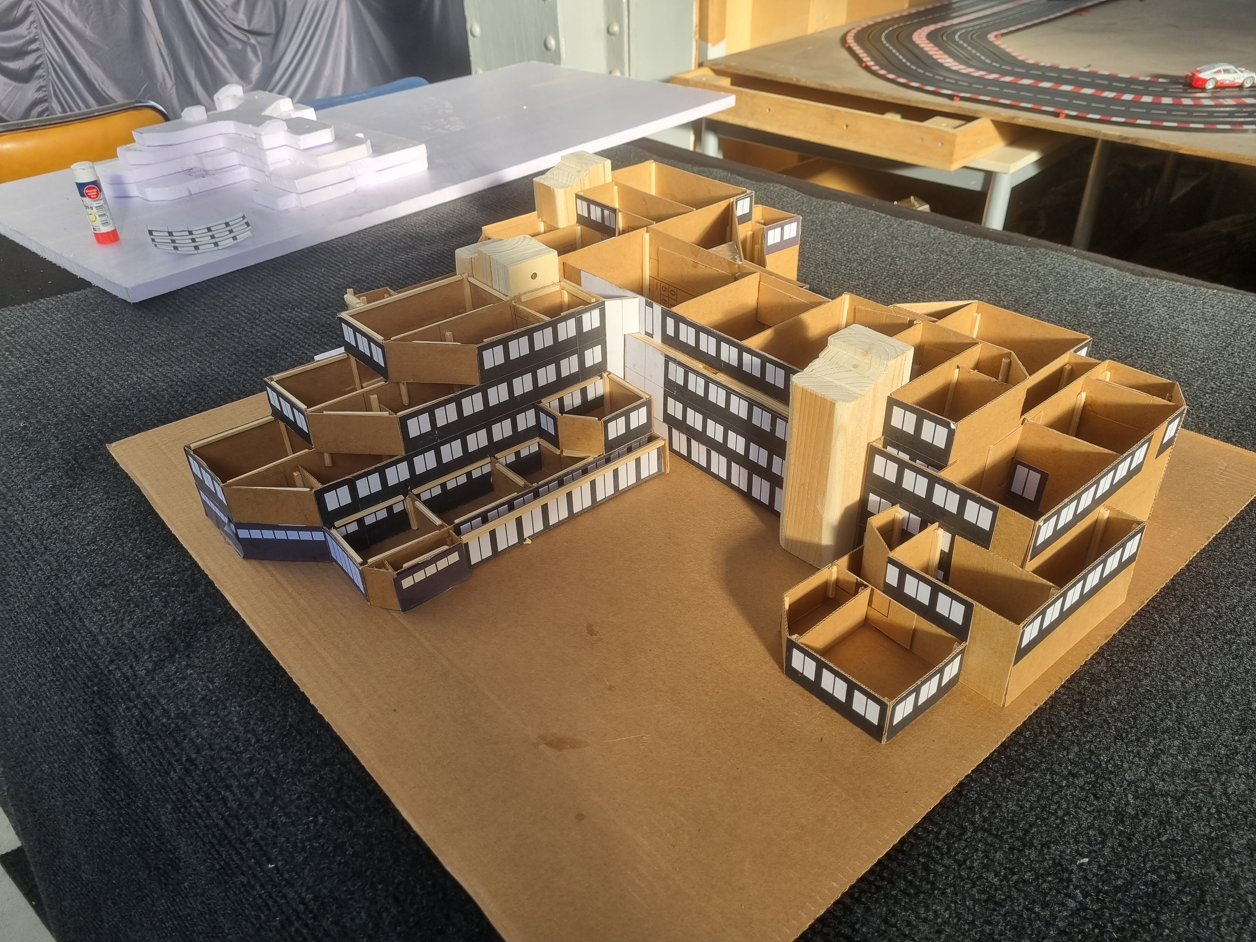 Wir bleiben KONSTRUKTIV. Hier ein Foto zum Entstehungsstand unseres endgültigen VHS-Anschauungsmodells. Es handelt sich um ein Massenmodell aus Styropor, davor ein Arbeitsmodell aus Pappe (eine Grundlage für die Entwicklung von Modellbauteilen und Gestaltungsdetails). Work-in progress! Herzlichen Dank an den engagierten Erbauer!