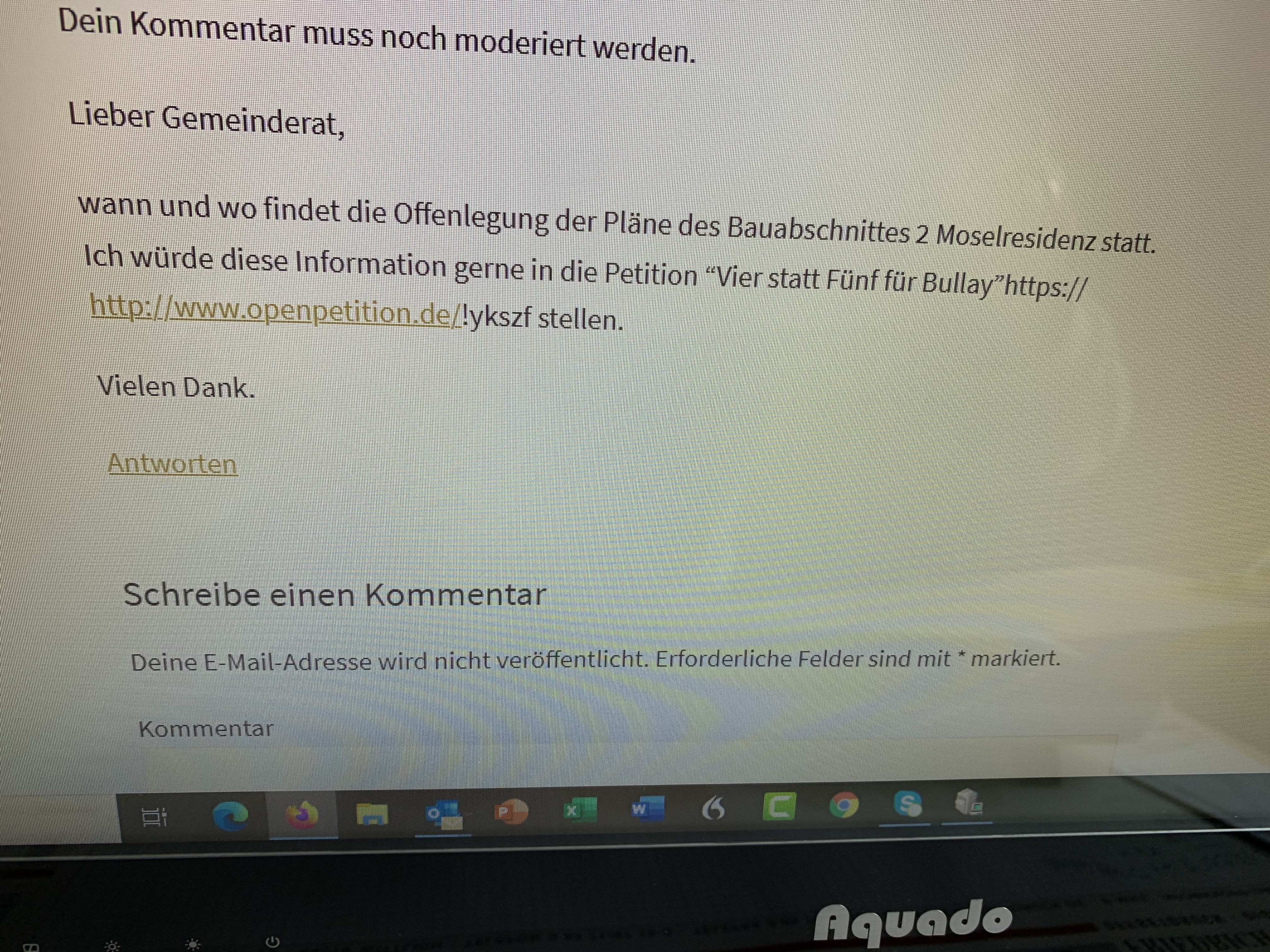 ich habe heute den direkten Kontakt zum Gemeinderat gesucht. Wie ich erfahren habe, soll es noch diese Woche zur Offenlegung des Bauvorhabens kommen. Dies ist ein wichtiger Termin für uns. Wir können hier unsere Einwände/ Befürchtungen und Wünsche äußern. Schaut Euch bitte auf der Homepage von Bullay unter "Aktuelles" den Animationsfilm über das Bauvorhaben an. Hier lässt sich die Dimension erahnen. Ich melde mich, sobald ich etwas über den Ort oder Zeitpunkt des Termines erfahre. Es wäre toll, wenn wir in einer möglichst großen Gruppe erscheinen. Selbstverständlich ist die Corona-Etikette zu beachten.