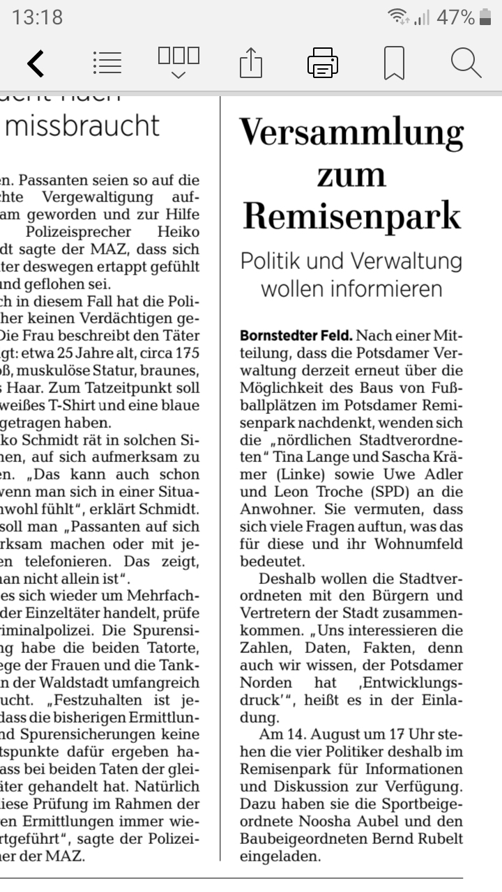Am 14. August 2020 findet ab 17:00 Uhr eine Informationsveranstaltung im Volkspark/ Remisenpark zum weiteren gedachten Vorgehen statt.