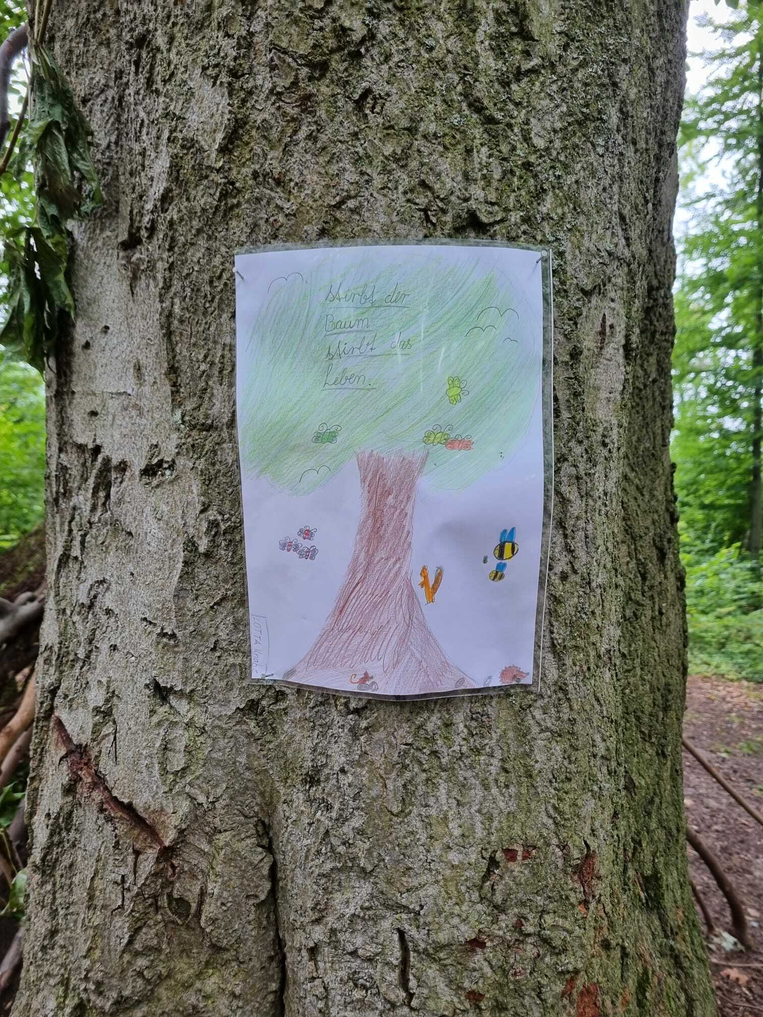 Ich habe ein Bild aus dem Stadtwald in den Anhang geladen. Dieses zeigt ein von Kinderhand gemaltes Bild mit der Aufschrift: "stirbt der Baum, stirbt das Leben."