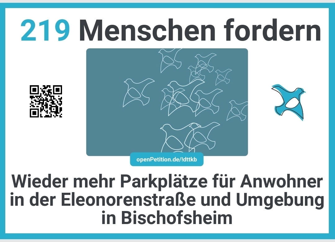 vielen Dank, dass Du unsere Petition „Wieder mehr Parkplätze für Anwohner in der Eleonorenstraße und Umgebung in Bischofsheim“ bereits unterschrieben hast! Deine Stimme zählt – doch damit unser gemeinsames Anliegen richtig Gehör findet, brauchen wir noch mehr Mitstreiterinnen und Mitstreiter.