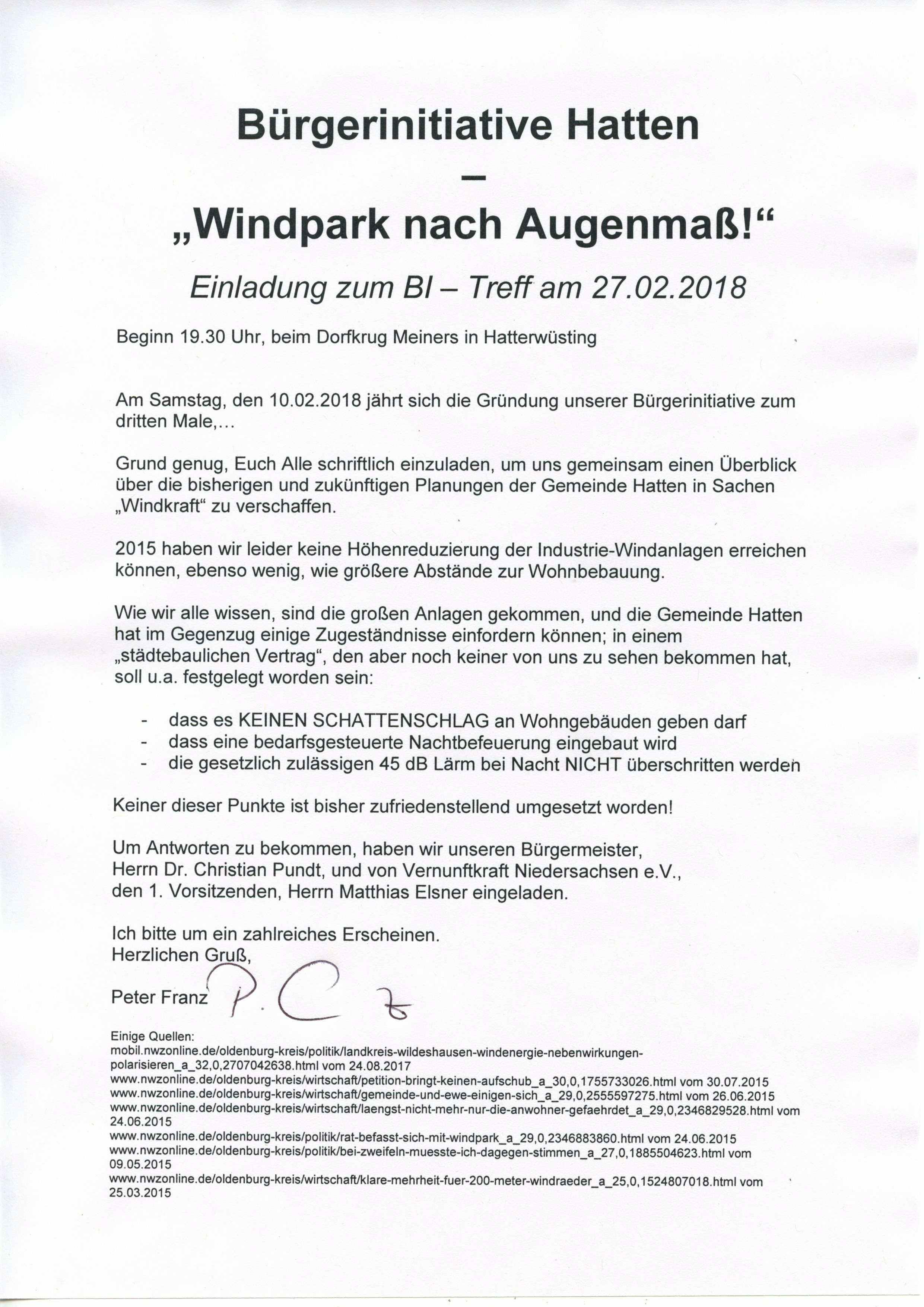 Zitat NWZ vom 12.02.15:„Auf einer Informationsveranstaltung von Bürgern zum geplanten Windpark an der Hatter Landstraße ist es am Dienstag zur angestrebten Gründung der Bürgerinitiative Hatten – „Windpark nach Augenmaß!“ gekommen.